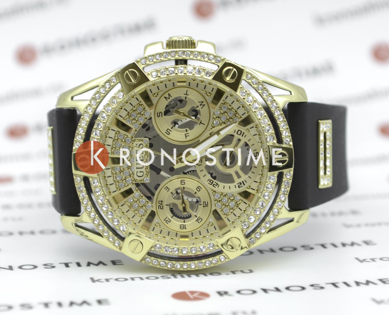 Женские наручные часы-скелетоны с минеральным стекломМинеральное стеклоМинеральное стекло представляет собой искусственно выращенный минерал кварца. Такое стекло отличается особой устойчивостью к повреждениям и царапинам. Уступает по некоторым качествам сапфировому стеклу. Guess Queen GW0536L3, кварцевый механизм с высокой точностью. Класс водозащиты: 30 метров, позволит защитить корпус от случайных брызг или капель дождя. Корпус часов изготовлен из стали с IP-покрытиемIP-покрытиеМетод ионного напыления. Демонстрирует повышенную устойчивость к истиранию, окислению и химическим веществам. Под воздействием высокого давления и температуры около 1500°C молекулы металла надёжно соединяются с частицами корпуса часов.. Силиконовый ремешок на стандартной застёжке. 24-х часовой формат времени, дата и день недели вынесены на отдельные циферблаты. Метки в виде штрихов. Рифленая заводная головка с защитой. Циферблат и ремешок украшены кристаллами.