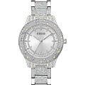 Женские наручные часы с минеральным стекломМинеральное стеклоМинеральное стекло представляет собой искусственно выращенный минерал кварца. Такое стекло отличается особой устойчивостью к повреждениям и царапинам. Уступает по некоторым качествам сапфировому стеклу. Guess Trend GW0746L1, кварцевый механизм с высокой точностью. Корпус часов изготовлен из стали. БезельБезельВнешний ободок, закрепляющий стекло. В спортивных часах так называется поворотное кольцо с делениями на циферблате, выполняет роль таймера – замеряет отрезки времени на шкале. Неподвижный безель – элемент декора. Однонаправленно вращающийся безель на дайверских часах позволяет фиксировать моменты погружения и выныривания на поверхность., корпус и циферблат украшены кристаллами. Класс водозащиты: 30 метров, позволит защитить корпус от случайных брызг или капель дождя. Стальной браслет на раскладной застёжкеРаскладная застёжкаТакой тип застёжки используется только на браслетах из металла. Она никогда не раскрывается полностью, происходит разделение на 2 и более частей. Раскладывающая застёжка снизит вероятность потери часов к минимуму..