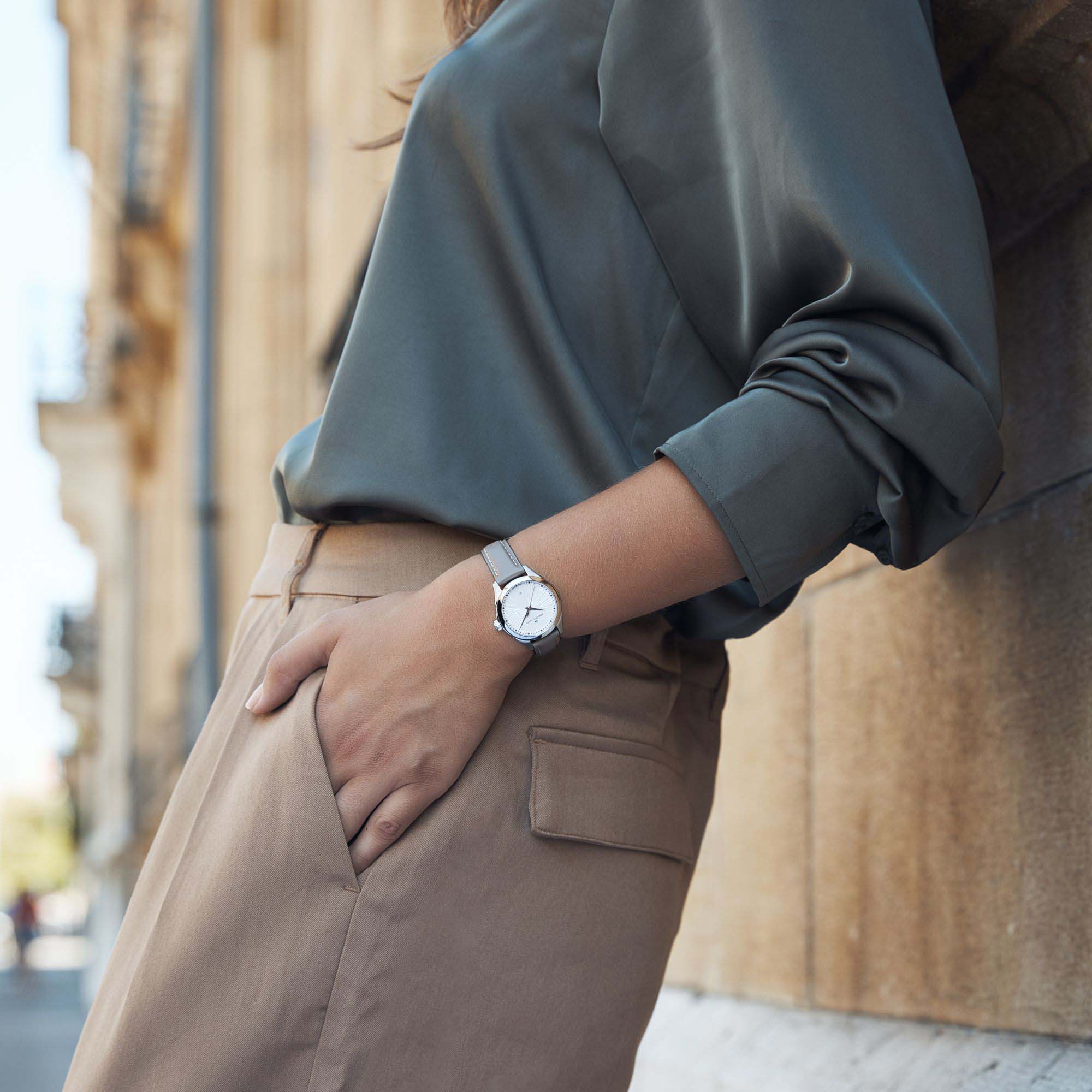 Изящные линии создают иллюзию движения на серебристо-белом циферблате нашего Jazzmaster Lady Quartz. В сочетании с мягким на ощупь кожаным ремешком эти изысканные 30-миллиметровые часы подчеркнут любой образ. Кварцевый механизм с высокой точностью. Сапфировое стеклоСапфировое стеклоПрочный и надёжный материал из кристалла сапфира синтетического происхождения, характеризующийся особой твёрдостью и устойчивостью к царапинам и повреждениям. устойчивое к появлению царапин, обладающее высокой прозрачностью. Класс водозащиты: 50 метров, позволит защитить корпус от случайных брызг или капель дождя. Корпус часов изготовлен из нержавеющей стали.