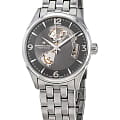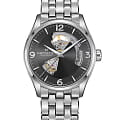 Мужские часы-скелетоны Hamilton Jazzmaster Open Heart Auto H32705181 с автоматическим механизмом Н-10. Корпус часов изготовлен из нержавеющей стали. Стрелки и метки с люминесцентным покрытиемЛюминесцентное покрытиеПозволяет считывать показания времени в темноте. Производители наносят на стрелки, часовые индексы, безель или поверхность циферблата светонакопительный состав, дающий холодное свечение.. Сапфировое стеклоСапфировое стеклоПрочный и надёжный материал из кристалла сапфира синтетического происхождения, характеризующийся особой твёрдостью и устойчивостью к царапинам и повреждениям. с антибликовым покрытием. Стальной браслет на застёжке-бабочке с кнопкамиЗастёжка "бабочка"Такой вид застёжки дополняется предохранителями, помогающими избежать случайного раскрытия браслета. Обладают изящным исполнением. . Уровень влагозащиты: 50 метров, позволит защитить корпус от случайных брызг или капель дождя.