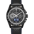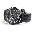 Hamilton Jazzmaster Performer Autochrono H36646780 — современный спортивный хронограф, сочетающий элегантный стиль, динамичные формы и проверенную швейцарскую механику. Корпус диаметром 42 мм изготовлен из нержавеющей стали с PVD-покрытиемPVDУльтратонкое покрытие наносится в технике вакуумного напыления, сочетает в себе нитрид титана особой прочности со слоем золота или оксида хрома. Несёт в себе декоративную или защитную функцию. чёрного цвета, придающим модели дерзкий и уверенный характер. Прозрачная задняя крышка позволяет наблюдать за работой механизма. Циферблат защищён сапфировым стекломСапфировое стеклоПрочный и надёжный материал из кристалла сапфира синтетического происхождения, характеризующийся особой твёрдостью и устойчивостью к царапинам и повреждениям. с антибликовым покрытиемАнтибликовое покрытиеСлой оксида металла в 0,13-0,3 микрон, благодаря которому стекло часов не бликует и не отражает свет. Антибликовое покрытие уменьшает отражение света в 10 раз, обеспечивая отличную читаемость показателей циферблата.. Антрацитовый циферблат с тремя счётчиками оформлен в классическом стиле автоспорта: 30-минутный и 12-часовой субциферблаты, малая секунда и тахиметрическая шкала по внешнему кольцу. Индексы и стрелки имеют люминесцентное покрытиеЛюминесцентное покрытиеПозволяет считывать показания времени в темноте. Производители наносят на стрелки, часовые индексы, безель или поверхность циферблата светонакопительный состав, дающий холодное свечение. для читаемости в темноте. Внутри установлен автоматический калибр хронографХронографФункция позволяет измерять отрезки времени с особой точностью: часы, минуты, секунды. Верным признаком хронографа является наличие на циферблате 3 дополнительных окошек-счётчиков. H-31 (на базе Valjoux 7753) с запасом хода до 60 часов и пружиной из сплава Nivachron™Nivachron™Специально разработанный инновационный сплав Nivachron™ повышает устойчивость часов к воздействию магнитных полей., устойчивой к воздействию магнитных полей. Модель комплектуется чёрным перфорированным кожаным ремешком с синей прострочкой и раскладной застёжкойРаскладная застёжкаТакой тип застёжки используется только на браслетах из металла. Она никогда не раскрывается полностью, происходит разделение на 2 и более частей. Раскладывающая застёжка снизит вероятность потери часов к минимуму., что обеспечивает надёжную фиксацию на запястье. Водонепроницаемость 100 метров делает Jazzmaster Performer Autochrono надёжным спутником для активной повседневной жизни.