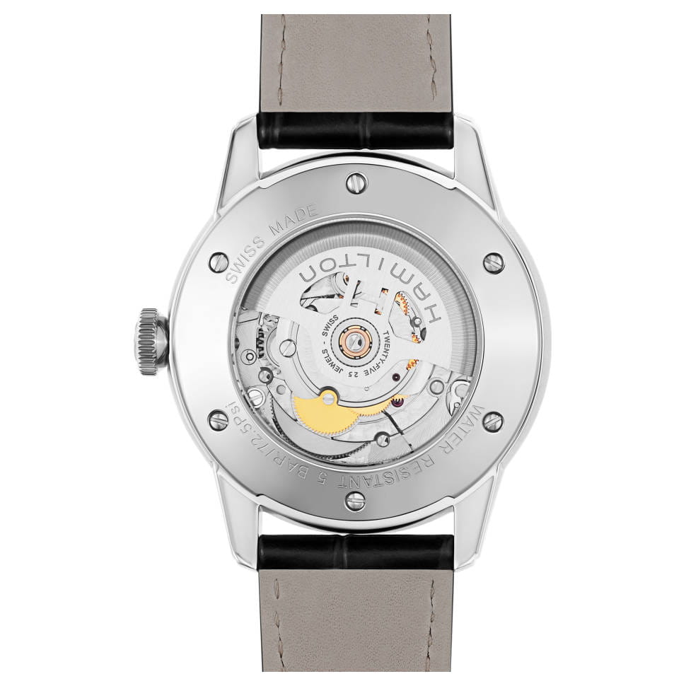 Компания Hamilton никогда не недооценивает мощь классических часов с тремя стрелками, которые опираются на наше наследие, фирменный стиль и американский дух. От старых железных дорог до современных наручных часов автоматический механизм H-10 с 80-часовым запасом хода и динамичным дизайном циферблата, напоминающим колеса ранних паровозов, созданы друг для друга. Механический механизм (автоматический калибр) с высокой точностью. Сапфировое стеклоСапфировое стеклоПрочный и надёжный материал из кристалла сапфира синтетического происхождения, характеризующийся особой твёрдостью и устойчивостью к царапинам и повреждениям. устойчивое к появлению царапин, обладающее высокой прозрачностью. Класс водозащиты: 50 метров, позволит защитить корпус от случайных брызг или капель дождя. Корпус часов изготовлен из нержавеющей стали. Кожаный ремешок с раскладной застёжкойРаскладная застёжкаТакой тип застёжки используется только на браслетах из металла. Она никогда не раскрывается полностью, происходит разделение на 2 и более частей. Раскладывающая застёжка снизит вероятность потери часов к минимуму..
