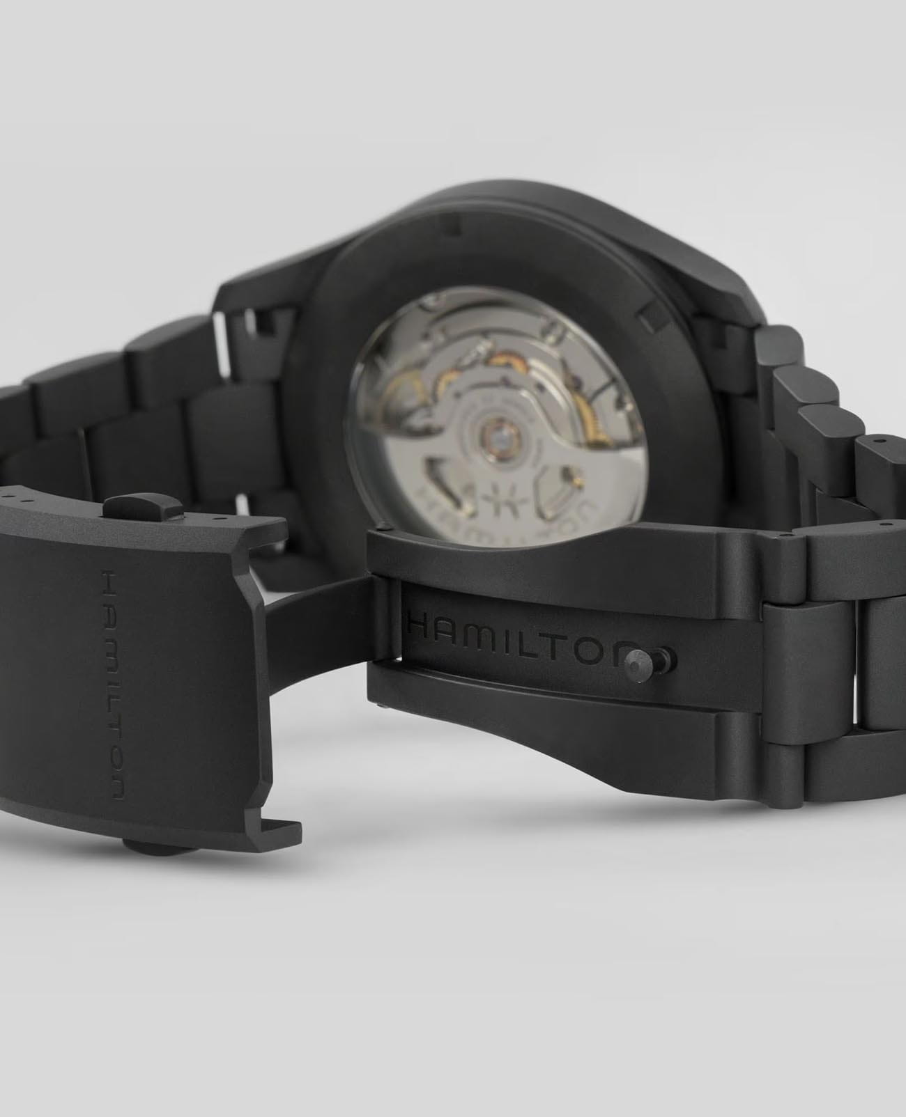 Мужские часы Hamilton Khaki Field Titanium Auto H70215130 с надёжным автоматическим механизмом. Корпус и браслет часов выполнены из титана с черным PVD-покрытиемPVDУльтратонкое покрытие наносится в технике вакуумного напыления, сочетает в себе нитрид титана особой прочности со слоем золота или оксида хрома. Несёт в себе декоративную или защитную функцию.. Браслет на раскладной застёжкеРаскладная застёжкаТакой тип застёжки используется только на браслетах из металла. Она никогда не раскрывается полностью, происходит разделение на 2 и более частей. Раскладывающая застёжка снизит вероятность потери часов к минимуму.. Сапфировое стеклоСапфировое стеклоПрочный и надёжный материал из кристалла сапфира синтетического происхождения, характеризующийся особой твёрдостью и устойчивостью к царапинам и повреждениям. с антибликовым покрытием. Класс водозащиты: 100 метров, позволит плавать, нырять и заниматься другими водными видами спорта. Стрелки и метки с люминесцентным покрытиемЛюминесцентное покрытиеПозволяет считывать показания времени в темноте. Производители наносят на стрелки, часовые индексы, безель или поверхность циферблата светонакопительный состав, дающий холодное свечение.. 12 и 24-часовой формат времени