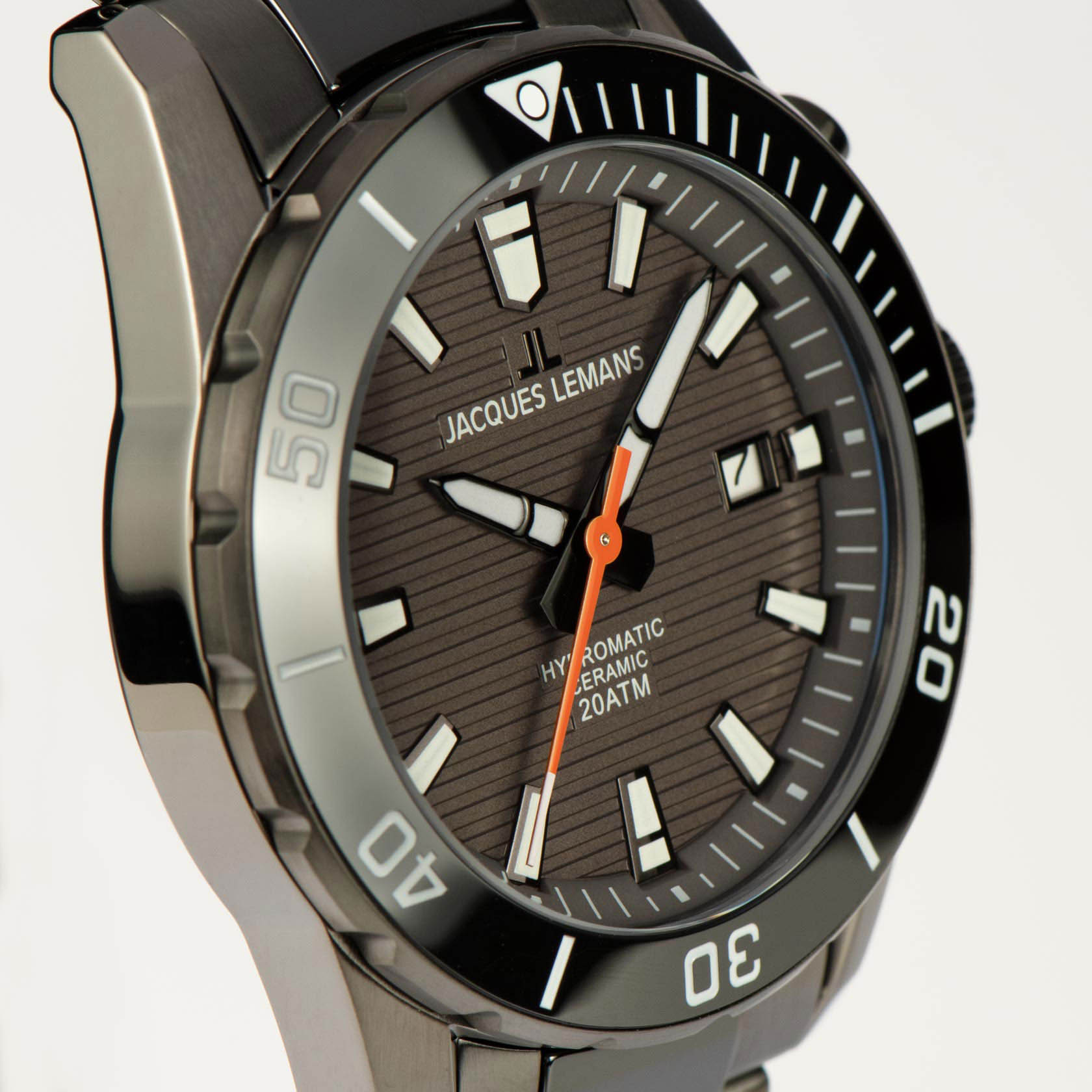 Мужские часы Jacques Lemans Venice 1-2222A с сапфировым стекломСапфировое стеклоПрочный и надёжный материал из кристалла сапфира синтетического происхождения, характеризующийся особой твёрдостью и устойчивостью к царапинам и повреждениям., гибрид кварца и механики с автоподзаводом. Лимитированная серия революционных часов Hybromatic: всего выпущено 999 штук каждой модели. Вращающийся безельБезельВнешний ободок, закрепляющий стекло. В спортивных часах так называется поворотное кольцо с делениями на циферблате, выполняет роль таймера – замеряет отрезки времени на шкале. Неподвижный безель – элемент декора. Однонаправленно вращающийся безель на дайверских часах позволяет фиксировать моменты погружения и выныривания на поверхность. из нержавеющей стали с PVDPVDУльтратонкое покрытие наносится в технике вакуумного напыления, сочетает в себе нитрид титана особой прочности со слоем золота или оксида хрома. Несёт в себе декоративную или защитную функцию. покрытием. Стрелки и метки с люминесцентным покрытиемЛюминесцентное покрытиеПозволяет считывать показания времени в темноте. Производители наносят на стрелки, часовые индексы, безель или поверхность циферблата светонакопительный состав, дающий холодное свечение.. Окошко даты расположено в позиции «3 часа». Класс водозащиты: 200 метров, позволит плавать, нырять и заниматься другими водными видами спорта. Прозрачная задняя крышка позволит в подробностях разглядеть необычный механизм. Браслет из нержавеющей стали с PVDPVDУльтратонкое покрытие наносится в технике вакуумного напыления, сочетает в себе нитрид титана особой прочности со слоем золота или оксида хрома. Несёт в себе декоративную или защитную функцию. покрытием и высокотехнологичной керамикиВысокотехнологичная керамикаИнновационный запатентованный Rado материал с гладкой или матовой поверхностью. Керамика за счёт кристаллической структуры обладает повышенной устойчивостью от возникновения царапин. Материал способен принимать температуру тела человека, обеспечивая невероятный комфорт при ношении. на раскладной застёжкеРаскладная застёжкаТакой тип застёжки используется только на браслетах из металла. Она никогда не раскрывается полностью, происходит разделение на 2 и более частей. Раскладывающая застёжка снизит вероятность потери часов к минимуму..