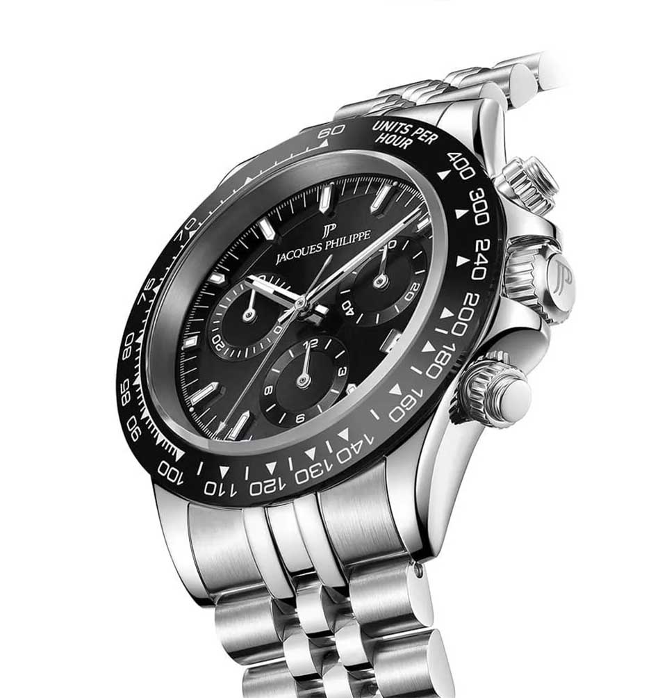 Швейцарские наручные часы Jacques Philippe JPQGC711316SBB сочетают в себе современный дизайн, надежность и функциональность, это стильные швейцарские часы с функцией хронографаХронографФункция позволяет измерять отрезки времени с особой точностью: часы, минуты, секунды. Верным признаком хронографа является наличие на циферблате 3 дополнительных окошек-счётчиков. и секундомераСекундомерСекундоме́р — прибор, способный измерять интервалы времени с точностью до долей секунды.. Корпус круглой формы диаметром 39 мм выполнен из прочной нержавеющей стали, а безельБезельВнешний ободок, закрепляющий стекло. В спортивных часах так называется поворотное кольцо с делениями на циферблате, выполняет роль таймера – замеряет отрезки времени на шкале. Неподвижный безель – элемент декора. Однонаправленно вращающийся безель на дайверских часах позволяет фиксировать моменты погружения и выныривания на поверхность. с элегантным черным IP-покрытиемIP-покрытиеМетод ионного напыления. Демонстрирует повышенную устойчивость к истиранию, окислению и химическим веществам. Под воздействием высокого давления и температуры около 1500°C молекулы металла надёжно соединяются с частицами корпуса часов., а сапфировое стеклоСапфировое стеклоПрочный и надёжный материал из кристалла сапфира синтетического происхождения, характеризующийся особой твёрдостью и устойчивостью к царапинам и повреждениям. надежно защищает черный циферблат от царапин и повреждений. Модель оснащена точным кварцевым механизмом RONDA 5030.D-4H, а также дополнительными функциями — тахиметромТахиметрРазмеченная шкала, располагается на ободке или безеле часов. Тахиметр позволяет рассчитать скорость на определённом участке пути, расстояние измеряется в километрах или милях. и индикатором даты, что делает часы не только стильным аксессуаром, но и практичным помощником на каждый день. Серебристый браслет шириной 20 мм удобно фиксируется на запястье с помощью застежки «бабочка»Застёжка "бабочка"Такой вид застёжки дополняется предохранителями, помогающими избежать случайного раскрытия браслета. Обладают изящным исполнением. . Стрелки имеют люминесцентное покрытиеЛюминесцентное покрытиеПозволяет считывать показания времени в темноте. Производители наносят на стрелки, часовые индексы, безель или поверхность циферблата светонакопительный состав, дающий холодное свечение. для удобства чтения времени в темноте. Водозащита 5 АТМ позволяет не снимать часы при дожде и случайных контактах с водой.