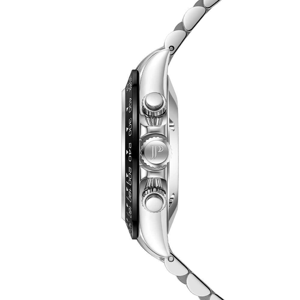Швейцарские наручные часы Jacques Philippe JPQGC711326SBB сочетают в себе современный дизайн, надежность и функциональность, это стильные швейцарские часы с функцией хронографаХронографФункция позволяет измерять отрезки времени с особой точностью: часы, минуты, секунды. Верным признаком хронографа является наличие на циферблате 3 дополнительных окошек-счётчиков. и секундомераСекундомерСекундоме́р — прибор, способный измерять интервалы времени с точностью до долей секунды.. Корпус круглой формы диаметром 39 мм выполнен из прочной нержавеющей стали, а безельБезельВнешний ободок, закрепляющий стекло. В спортивных часах так называется поворотное кольцо с делениями на циферблате, выполняет роль таймера – замеряет отрезки времени на шкале. Неподвижный безель – элемент декора. Однонаправленно вращающийся безель на дайверских часах позволяет фиксировать моменты погружения и выныривания на поверхность. с элегантным черным IP-покрытиемIP-покрытиеМетод ионного напыления. Демонстрирует повышенную устойчивость к истиранию, окислению и химическим веществам. Под воздействием высокого давления и температуры около 1500°C молекулы металла надёжно соединяются с частицами корпуса часов., а сапфировое стеклоСапфировое стеклоПрочный и надёжный материал из кристалла сапфира синтетического происхождения, характеризующийся особой твёрдостью и устойчивостью к царапинам и повреждениям. надежно защищает белый циферблат от царапин и повреждений. Модель оснащена точным кварцевым механизмом RONDA 5030.D-4H, а также дополнительными функциями — тахиметромТахиметрРазмеченная шкала, располагается на ободке или безеле часов. Тахиметр позволяет рассчитать скорость на определённом участке пути, расстояние измеряется в километрах или милях. и индикатором даты, что делает часы не только стильным аксессуаром, но и практичным помощником на каждый день. Серебристый браслет шириной 20 мм удобно фиксируется на запястье с помощью застежки «бабочка»Застёжка "бабочка"Такой вид застёжки дополняется предохранителями, помогающими избежать случайного раскрытия браслета. Обладают изящным исполнением. . Стрелки имеют люминесцентное покрытиеЛюминесцентное покрытиеПозволяет считывать показания времени в темноте. Производители наносят на стрелки, часовые индексы, безель или поверхность циферблата светонакопительный состав, дающий холодное свечение. для удобства чтения времени в темноте. Водозащита 5 АТМ позволяет не снимать часы при дожде и случайных контактах с водой.