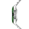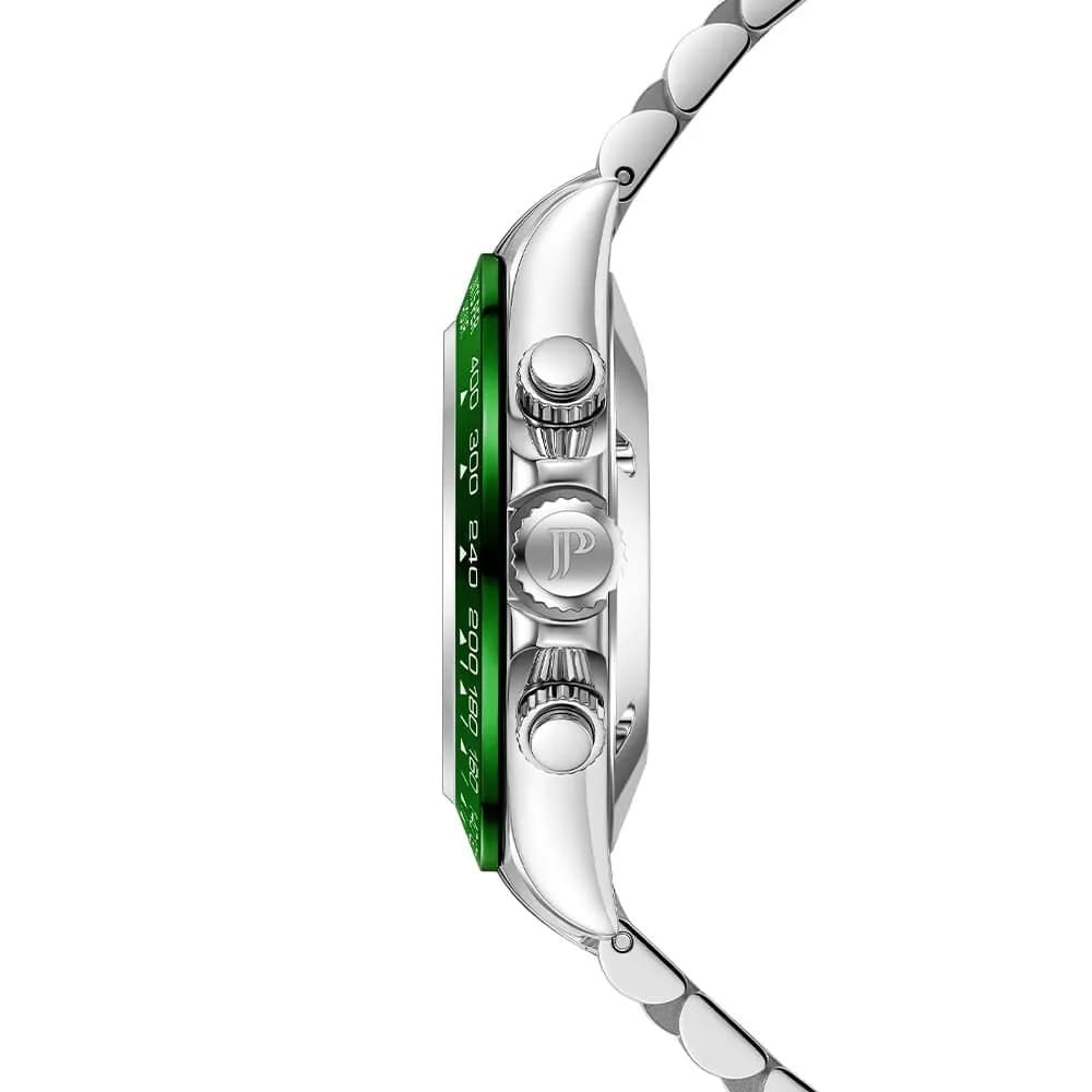 Швейцарские наручные часы Jacques Philippe JPQGC7113X6SBG сочетают в себе современный дизайн, надежность и функциональность, это стильные швейцарские часы с функцией хронографаХронографФункция позволяет измерять отрезки времени с особой точностью: часы, минуты, секунды. Верным признаком хронографа является наличие на циферблате 3 дополнительных окошек-счётчиков. и секундомераСекундомерСекундоме́р — прибор, способный измерять интервалы времени с точностью до долей секунды.. Корпус круглой формы диаметром 39 мм выполнен из прочной нержавеющей стали, а безельБезельВнешний ободок, закрепляющий стекло. В спортивных часах так называется поворотное кольцо с делениями на циферблате, выполняет роль таймера – замеряет отрезки времени на шкале. Неподвижный безель – элемент декора. Однонаправленно вращающийся безель на дайверских часах позволяет фиксировать моменты погружения и выныривания на поверхность. с элегантным зеленым IP-покрытиемIP-покрытиеМетод ионного напыления. Демонстрирует повышенную устойчивость к истиранию, окислению и химическим веществам. Под воздействием высокого давления и температуры около 1500°C молекулы металла надёжно соединяются с частицами корпуса часов., а сапфировое стеклоСапфировое стеклоПрочный и надёжный материал из кристалла сапфира синтетического происхождения, характеризующийся особой твёрдостью и устойчивостью к царапинам и повреждениям. надежно защищает зеленый циферблат от царапин и повреждений. Модель оснащена точным кварцевым механизмом RONDA 5030.D-4H, а также дополнительными функциями — тахиметромТахиметрРазмеченная шкала, располагается на ободке или безеле часов. Тахиметр позволяет рассчитать скорость на определённом участке пути, расстояние измеряется в километрах или милях. и индикатором даты, что делает часы не только стильным аксессуаром, но и практичным помощником на каждый день. Серебристый браслет шириной 20 мм удобно фиксируется на запястье с помощью застежки «бабочка»Застёжка "бабочка"Такой вид застёжки дополняется предохранителями, помогающими избежать случайного раскрытия браслета. Обладают изящным исполнением. . Стрелки имеют люминесцентное покрытиеЛюминесцентное покрытиеПозволяет считывать показания времени в темноте. Производители наносят на стрелки, часовые индексы, безель или поверхность циферблата светонакопительный состав, дающий холодное свечение. для удобства чтения времени в темноте. Водозащита 5 АТМ позволяет не снимать часы при дожде и случайных контактах с водой.