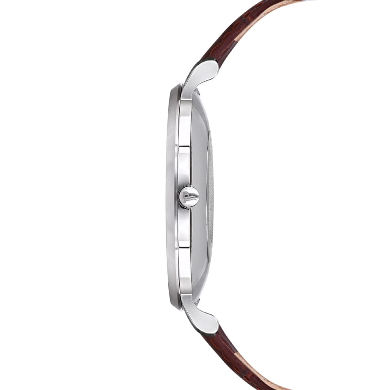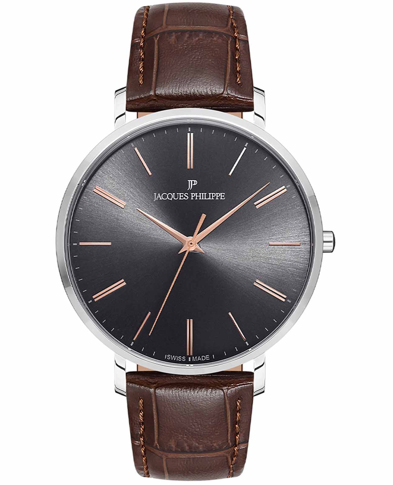 Jacques Philippe JPQGS071143N — утончённая мужская модель, воплощающая строгость классики и лёгкость современного дизайна. Корпус диаметром 41 мм выполнен из нержавеющей стали, а его минималистичный профиль с толщиной всего 7 мм делает посадку особенно комфортной даже под манжету рубашки. Циферблат оформлен в сером цвете с тонкими стрелками и лаконичными часовыми метками, создавая элегантное и понятное восприятие времени. Защиту обеспечивает прочное сапфировое стеклоСапфировое стеклоПрочный и надёжный материал из кристалла сапфира синтетического происхождения, характеризующийся особой твёрдостью и устойчивостью к царапинам и повреждениям., стойкое к царапинам и бликам. Внутри установлен надёжный кварцевый механизм, обеспечивающий высокую точность хода и не требующий подзавода. Это практичное решение для тех, кто ценит уверенность и простоту в использовании. Модель дополнена ремешком из натуральной кожи коричневого оттенка, шириной 20 мм, с классической пряжкой. Водозащита до 3 ATM защищает часы от брызг и дождя, сохраняя их аккуратный внешний вид в повседневной носке. JPQGS071143N — выбор для тех, кто предпочитает лаконичную эстетику, комфорт и надёжность, не перегруженную лишними деталями.