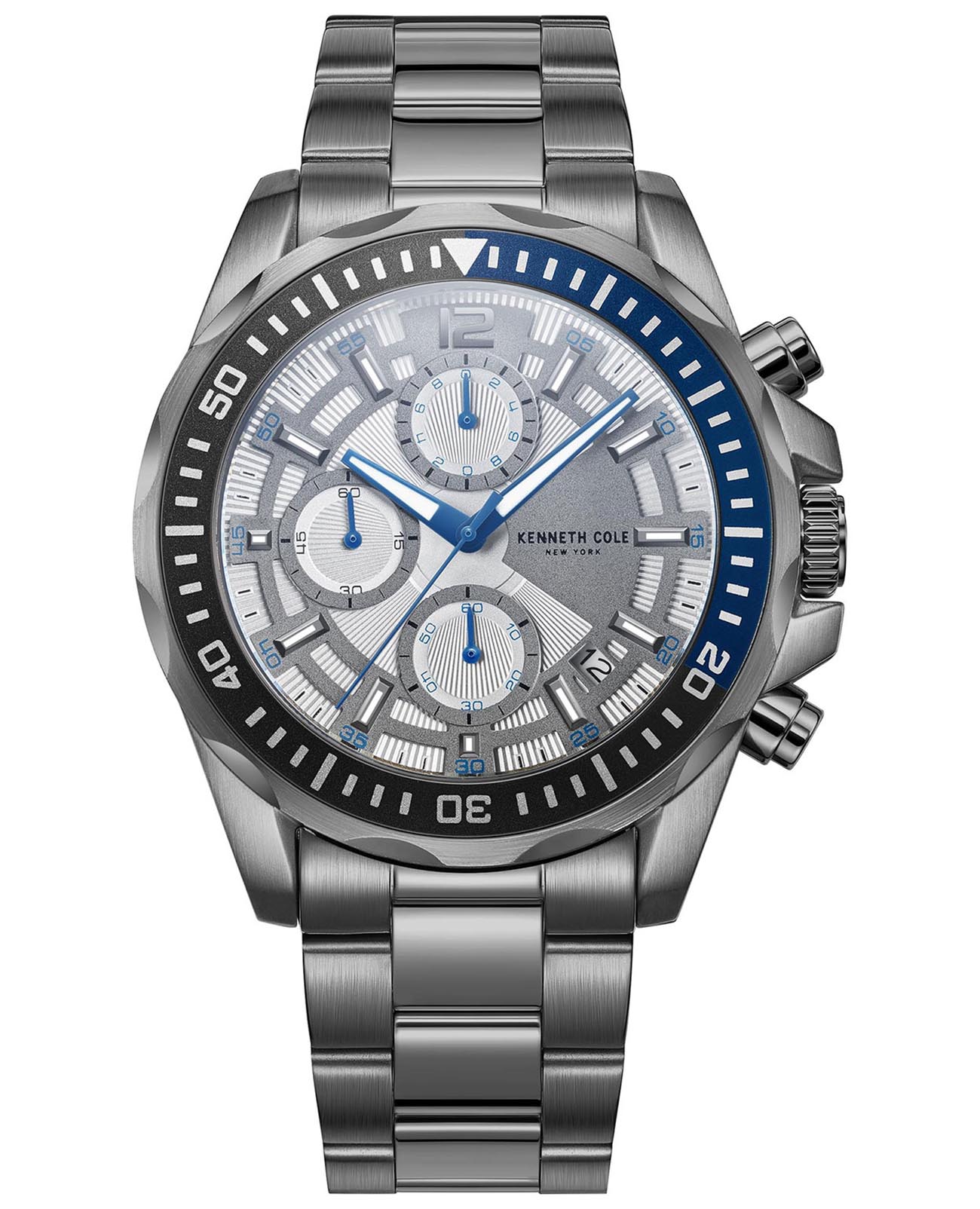 Мужские кварцевые часы-хронографХронографФункция позволяет измерять отрезки времени с особой точностью: часы, минуты, секунды. Верным признаком хронографа является наличие на циферблате 3 дополнительных окошек-счётчиков. с секундомеромСекундомерСекундоме́р — прибор, способный измерять интервалы времени с точностью до долей секунды. Kenneth Cole Dress Sport KCWGK2222201, кварцевый механизм с высокой точностью.  Класс водозащиты: 30 метров, позволит защитить корпус от случайных брызг или капель дождя. Корпус часов изготовлен из стали  с IP-покрытиемIP-покрытиеМетод ионного напыления. Демонстрирует повышенную устойчивость к истиранию, окислению и химическим веществам. Под воздействием высокого давления и температуры около 1500°C молекулы металла надёжно соединяются с частицами корпуса часов.. Стальной браслет на раскладной застёжкеРаскладная застёжкаТакой тип застёжки используется только на браслетах из металла. Она никогда не раскрывается полностью, происходит разделение на 2 и более частей. Раскладывающая застёжка снизит вероятность потери часов к минимуму.  с IP-покрытиемIP-покрытиеМетод ионного напыления. Демонстрирует повышенную устойчивость к истиранию, окислению и химическим веществам. Под воздействием высокого давления и температуры около 1500°C молекулы металла надёжно соединяются с частицами корпуса часов.. Заводная головка с защитой. БезельБезельВнешний ободок, закрепляющий стекло. В спортивных часах так называется поворотное кольцо с делениями на циферблате, выполняет роль таймера – замеряет отрезки времени на шкале. Неподвижный безель – элемент декора. Однонаправленно вращающийся безель на дайверских часах позволяет фиксировать моменты погружения и выныривания на поверхность. с IP-покрытиемIP-покрытиеМетод ионного напыления. Демонстрирует повышенную устойчивость к истиранию, окислению и химическим веществам. Под воздействием высокого давления и температуры около 1500°C молекулы металла надёжно соединяются с частицами корпуса часов.. Окошко даты находится в положении между 4 и 5 часами. Стрелки и метки с люминесцентным покрытиемЛюминесцентное покрытиеПозволяет считывать показания времени в темноте. Производители наносят на стрелки, часовые индексы, безель или поверхность циферблата светонакопительный состав, дающий холодное свечение..