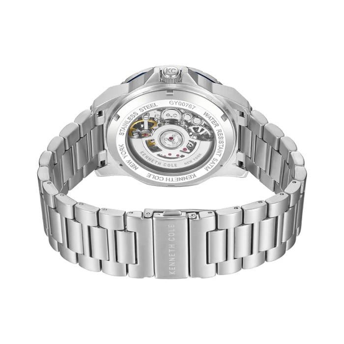 Мужские механические часы с автоподзаводом Kenneth Cole — это выразительный и элегантный аксессуар. Корпус диаметром 45 мм выполнен из нержавеющей стали 316L. Циферблат синего цвета оформлен в стиле скелетон, что позволяет наблюдать за работой механизма. Циферблат защищён минеральным стекломМинеральное стеклоМинеральное стекло представляет собой искусственно выращенный минерал кварца. Такое стекло отличается особой устойчивостью к повреждениям и царапинам. Уступает по некоторым качествам сапфировому стеклу.. Механизм — автоматический с функцией подзавода от движения руки. Прозрачная задняя крышка открывает вид на механизм. Часы оснащены стальным браслетом на раскладной застёжкеРаскладная застёжкаТакой тип застёжки используется только на браслетах из металла. Она никогда не раскрывается полностью, происходит разделение на 2 и более частей. Раскладывающая застёжка снизит вероятность потери часов к минимуму.. Водонепроницаемость 50 м позволяет использовать часы в повседневных условиях. Идеальный выбор для тех, кто ценит стиль, технологии и американское качество.