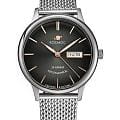 Российские мужские механические часы Космос K 043.10.35 с автоподзаводом оснащены корпусом из нержавеющей стали 316L диаметром 41 мм и защищены минеральным стекломМинеральное стеклоМинеральное стекло представляет собой искусственно выращенный минерал кварца. Такое стекло отличается особой устойчивостью к повреждениям и царапинам. Уступает по некоторым качествам сапфировому стеклу.. Дополнен функциями отображения даты и дня недели. Заводная головка декорирована логотипом бренда в виде стилизованного изображения планеты. Часы имеют водонепроницаемость 50 метров, позволит защитить корпус от случайных брызг или капель дождя. Модель комплектуется браслетом из нержавеющей стали 316L с миланским плетением на раскладном замкеРаскладной замокДанный вариант застежки используется только на часах с металлическим браслетом. Отличительная особенность такого крепления в том, что длина браслета становится универсальной и вы можете самостоятельно отрегулировать нужный вам размер – застежка просто двигается по браслету часов.. Специальные крепежи позволяют легко заменить браслет на часах самостоятельно. Прочный корпус и надежный механизм делают эти часы универсальным аксессуаром для повседневного использования. Уникальный дизайн и высокое качество материалов подчеркивают индивидуальность владельца.