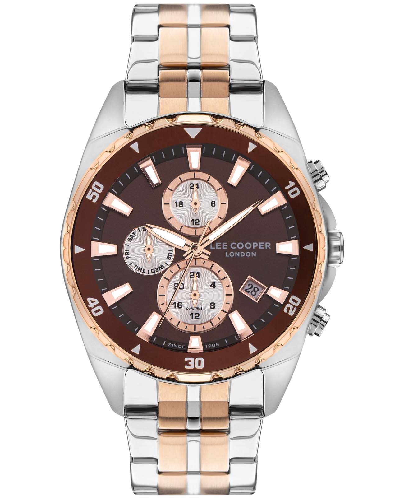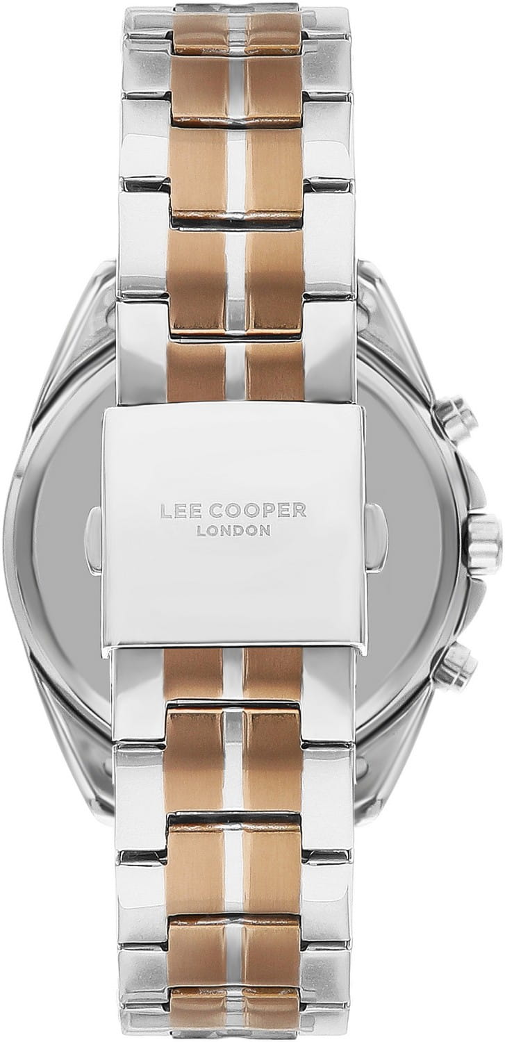 Мужские часы Lee Cooper LC07515.560 — это стильное сочетание элегантности и современного дизайна. Круглый корпус диаметром 44 мм выполнен из суперметалла серебристого цвета. БезельБезельВнешний ободок, закрепляющий стекло. В спортивных часах так называется поворотное кольцо с делениями на циферблате, выполняет роль таймера – замеряет отрезки времени на шкале. Неподвижный безель – элемент декора. Однонаправленно вращающийся безель на дайверских часах позволяет фиксировать моменты погружения и выныривания на поверхность. с IP-покрытиемIP-покрытиеМетод ионного напыления. Демонстрирует повышенную устойчивость к истиранию, окислению и химическим веществам. Под воздействием высокого давления и температуры около 1500°C молекулы металла надёжно соединяются с частицами корпуса часов. придает модели особый вид. Циферблат защищен минеральным стекломМинеральное стеклоМинеральное стекло представляет собой искусственно выращенный минерал кварца. Такое стекло отличается особой устойчивостью к повреждениям и царапинам. Уступает по некоторым качествам сапфировому стеклу., обеспечивающим устойчивость к царапинам. Метки в виде штрихов. Часы оснащены надежным кварцевым механизмом, а металлический браслет на раскладной застёжкеРаскладная застёжкаТакой тип застёжки используется только на браслетах из металла. Она никогда не раскрывается полностью, происходит разделение на 2 и более частей. Раскладывающая застёжка снизит вероятность потери часов к минимуму. с частичным IP-покрытиемIP-покрытиеМетод ионного напыления. Демонстрирует повышенную устойчивость к истиранию, окислению и химическим веществам. Под воздействием высокого давления и температуры около 1500°C молекулы металла надёжно соединяются с частицами корпуса часов. гарантирует комфортную посадку на запястье. Окошко даты находится в положении между 4 и 5 часов. Стрелки и метки с люминесцентным покрытиемЛюминесцентное покрытиеПозволяет считывать показания времени в темноте. Производители наносят на стрелки, часовые индексы, безель или поверхность циферблата светонакопительный состав, дающий холодное свечение. позволяют легко считывать время даже в условиях недостаточного освещения. Мультифункциональная модель с индикацией даты, дня недели, с дополнительным 24-х часовым индикатором. Водозащита 50 метров позволит защитить корпус от случайных брызг или капель дождя. Lee Cooper — отличный выбор для тех, кто ценит утонченность и качество.