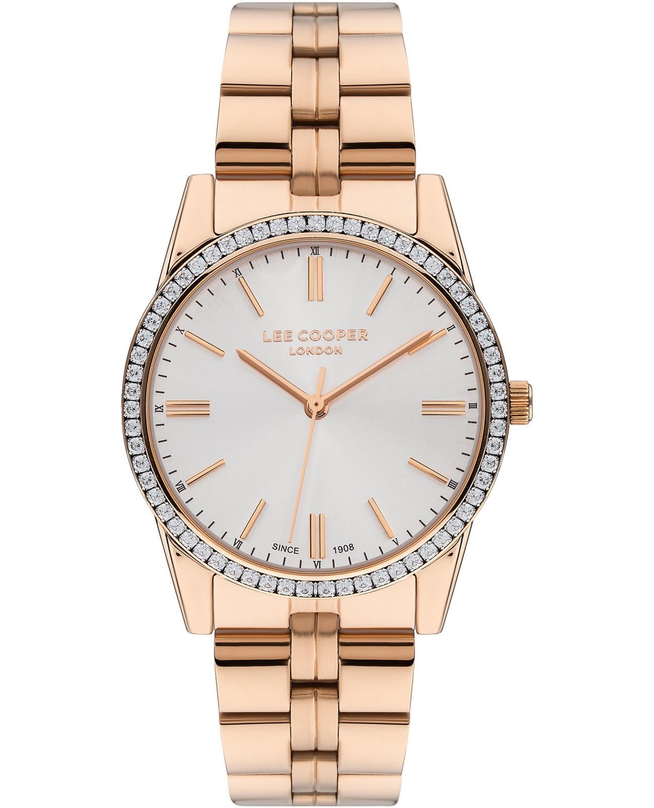 Женские наручные часы Lee Cooper LC07679.430 — это элегантная модель с утончённым дизайном. Корпус диаметром 35 мм выполнен из суперметалла с IP-покрытиемIP-покрытиеМетод ионного напыления. Демонстрирует повышенную устойчивость к истиранию, окислению и химическим веществам. Под воздействием высокого давления и температуры около 1500°C молекулы металла надёжно соединяются с частицами корпуса часов., что придаёт часам изысканный вид. Лаконичный циферблат украшен изящными метками и стрелками, обеспечивая удобное считывание времени. Циферблат защищён минеральным стекломМинеральное стеклоМинеральное стекло представляет собой искусственно выращенный минерал кварца. Такое стекло отличается особой устойчивостью к повреждениям и царапинам. Уступает по некоторым качествам сапфировому стеклу., устойчивым к царапинам. Изысканный безельБезельВнешний ободок, закрепляющий стекло. В спортивных часах так называется поворотное кольцо с делениями на циферблате, выполняет роль таймера – замеряет отрезки времени на шкале. Неподвижный безель – элемент декора. Однонаправленно вращающийся безель на дайверских часах позволяет фиксировать моменты погружения и выныривания на поверхность. украшен вставками из циркония. Часы работают на кварцевом механизме, обеспечивая точность хода. Браслет из нержавеющей стали с IP-покрытиемIP-покрытиеМетод ионного напыления. Демонстрирует повышенную устойчивость к истиранию, окислению и химическим веществам. Под воздействием высокого давления и температуры около 1500°C молекулы металла надёжно соединяются с частицами корпуса часов. имеет раскладную застёжкуРаскладная застёжкаТакой тип застёжки используется только на браслетах из металла. Она никогда не раскрывается полностью, происходит разделение на 2 и более частей. Раскладывающая застёжка снизит вероятность потери часов к минимуму., гарантирующую комфортное ношение и надёжную фиксацию на запястье. Водозащита WR30 защищает часы от случайных брызг и дождя, делая их подходящими для повседневного использования.