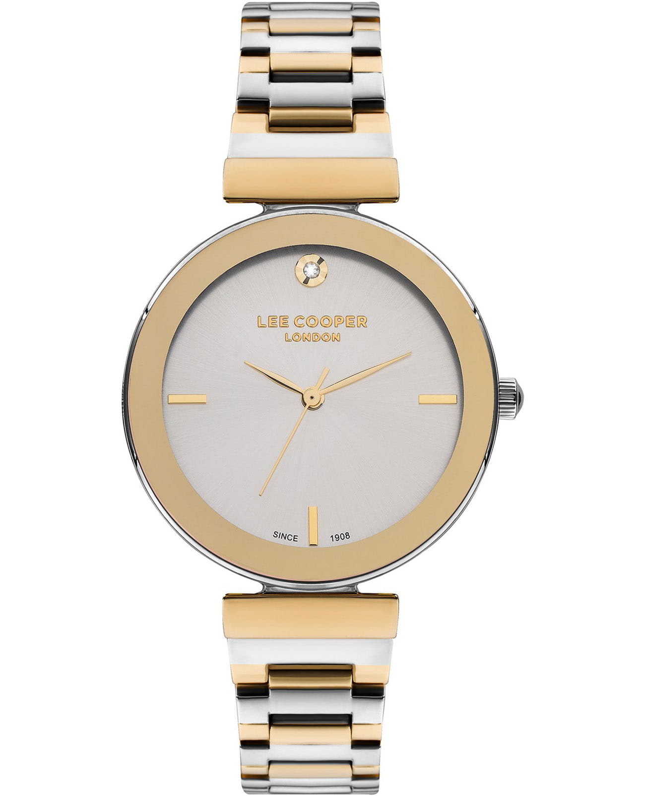 Женские часы Lee Cooper LC07711.230 — это стильное сочетание элегантности и современного дизайна. Круглый корпус диаметром 35 мм выполнен из суперметалла серебристого цвета. Неподвижный безельБезельВнешний ободок, закрепляющий стекло. В спортивных часах так называется поворотное кольцо с делениями на циферблате, выполняет роль таймера – замеряет отрезки времени на шкале. Неподвижный безель – элемент декора. Однонаправленно вращающийся безель на дайверских часах позволяет фиксировать моменты погружения и выныривания на поверхность. с IP-покрытиемIP-покрытиеМетод ионного напыления. Демонстрирует повышенную устойчивость к истиранию, окислению и химическим веществам. Под воздействием высокого давления и температуры около 1500°C молекулы металла надёжно соединяются с частицами корпуса часов. золотого цвета придает модели особый блеск. Изысканный циферблат защищен минеральным стекломМинеральное стеклоМинеральное стекло представляет собой искусственно выращенный минерал кварца. Такое стекло отличается особой устойчивостью к повреждениям и царапинам. Уступает по некоторым качествам сапфировому стеклу., обеспечивающим устойчивость к царапинам. Метки в виде штрихов. Часы оснащены надежным кварцевым механизмом, а стальной браслет с частичным IP-покрытиемIP-покрытиеМетод ионного напыления. Демонстрирует повышенную устойчивость к истиранию, окислению и химическим веществам. Под воздействием высокого давления и температуры около 1500°C молекулы металла надёжно соединяются с частицами корпуса часов. на раскладной застёжкеРаскладная застёжкаТакой тип застёжки используется только на браслетах из металла. Она никогда не раскрывается полностью, происходит разделение на 2 и более частей. Раскладывающая застёжка снизит вероятность потери часов к минимуму. гарантирует комфортную посадку на запястье. Водозащита 30 метров защищает модель от случайных брызг и дождя. Lee Cooper  — отличный выбор для тех, кто ценит утонченность и качество.