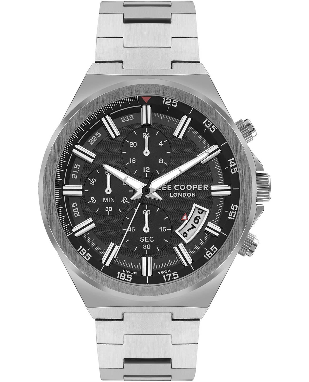Мужские наручные часы Lee Cooper LC07717.350 — элегантная модель с функциональными возможностями для повседневного использования. Изысканный корпус из суперметалла придаёт часам классический и современный вид.  Чёрный циферблат оснащён дополнительными индикаторами и функцией хронографХронографФункция позволяет измерять отрезки времени с особой точностью: часы, минуты, секунды. Верным признаком хронографа является наличие на циферблате 3 дополнительных окошек-счётчиков., что позволяет измерять временные интервалы с высокой точностью. Стрелки покрыты люминесцентным покрытиемЛюминесцентное покрытиеПозволяет считывать показания времени в темноте. Производители наносят на стрелки, часовые индексы, безель или поверхность циферблата светонакопительный состав, дающий холодное свечение., обеспечивая удобное считывание показаний в условиях недостаточного освещения. Циферблат защищён минеральным стекломМинеральное стеклоМинеральное стекло представляет собой искусственно выращенный минерал кварца. Такое стекло отличается особой устойчивостью к повреждениям и царапинам. Уступает по некоторым качествам сапфировому стеклу., устойчивым к царапинам.  Часы работают на кварцевом механизме, обеспечивающем точность хода. Элегантный браслет из нержавеющей стали на застёжке-бабочке с кнопкамиЗастёжка "бабочка"Такой вид застёжки дополняется предохранителями, помогающими избежать случайного раскрытия браслета. Обладают изящным исполнением. гарантирует удобную посадку и надёжную фиксацию на запястье. Водозащита 50 метров защищает часы от брызг и дождя, делая их подходящими для повседневного использования.