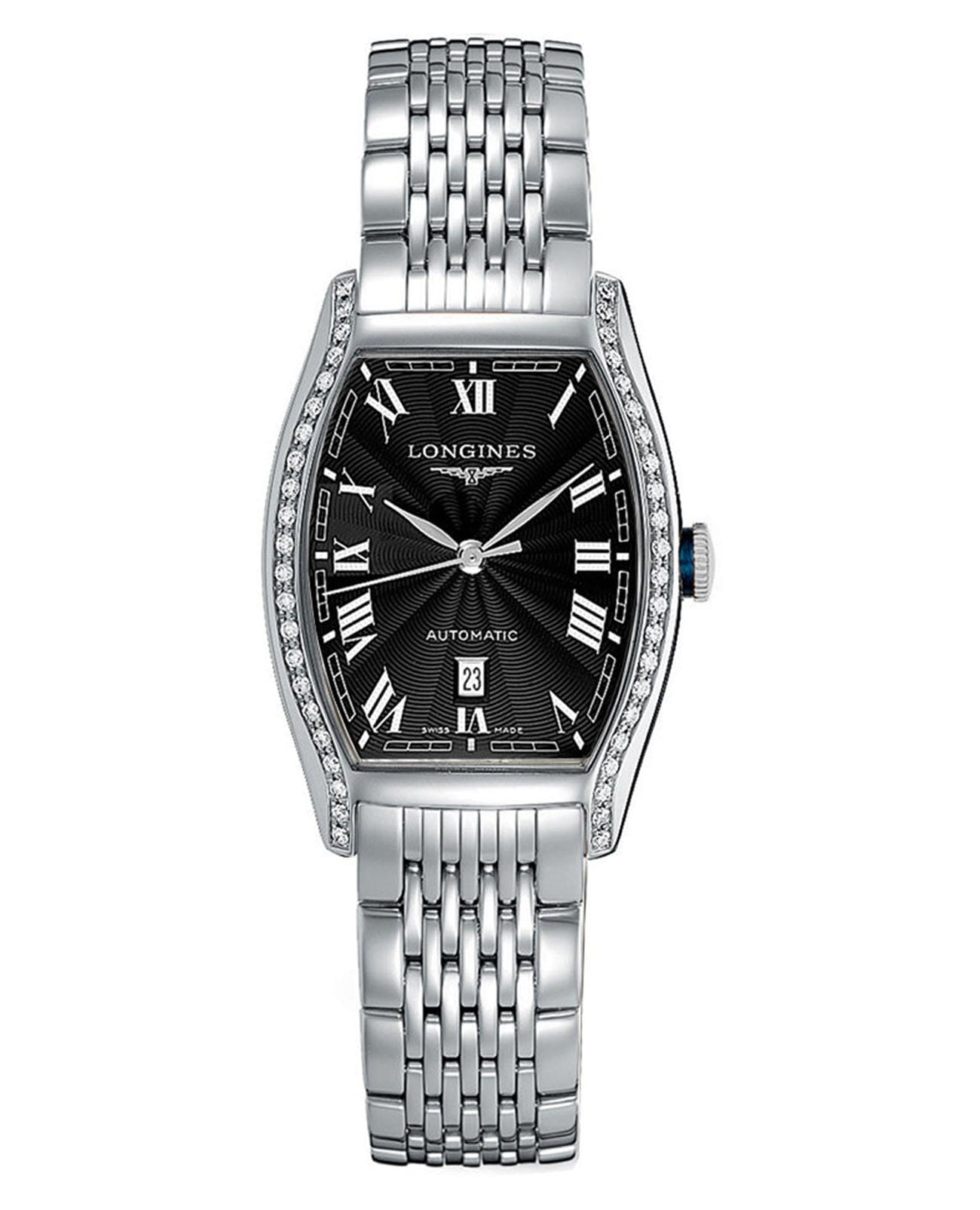Женские швейцарские механические часы с автоподзаводом Longines Evidenza L2.142.0.50.6. Сапфировое стеклоСапфировое стеклоПрочный и надёжный материал из кристалла сапфира синтетического происхождения, характеризующийся особой твёрдостью и устойчивостью к царапинам и повреждениям. устойчивое к появлению царапин, обладающее высокой прозрачностью. Корпус часов из нержавеющей стали украшен бриллиантами 0,37 карат. Нарисованные римские цифры. Окошко даты в положении 6 часов. Класс водозащиты: 30 метров, позволит защитить корпус от случайных брызг или капель дождя. Стальной браслет на застёжке «бабочка» с кнопкамиЗастёжка "бабочка"Такой вид застёжки дополняется предохранителями, помогающими избежать случайного раскрытия браслета. Обладают изящным исполнением. .