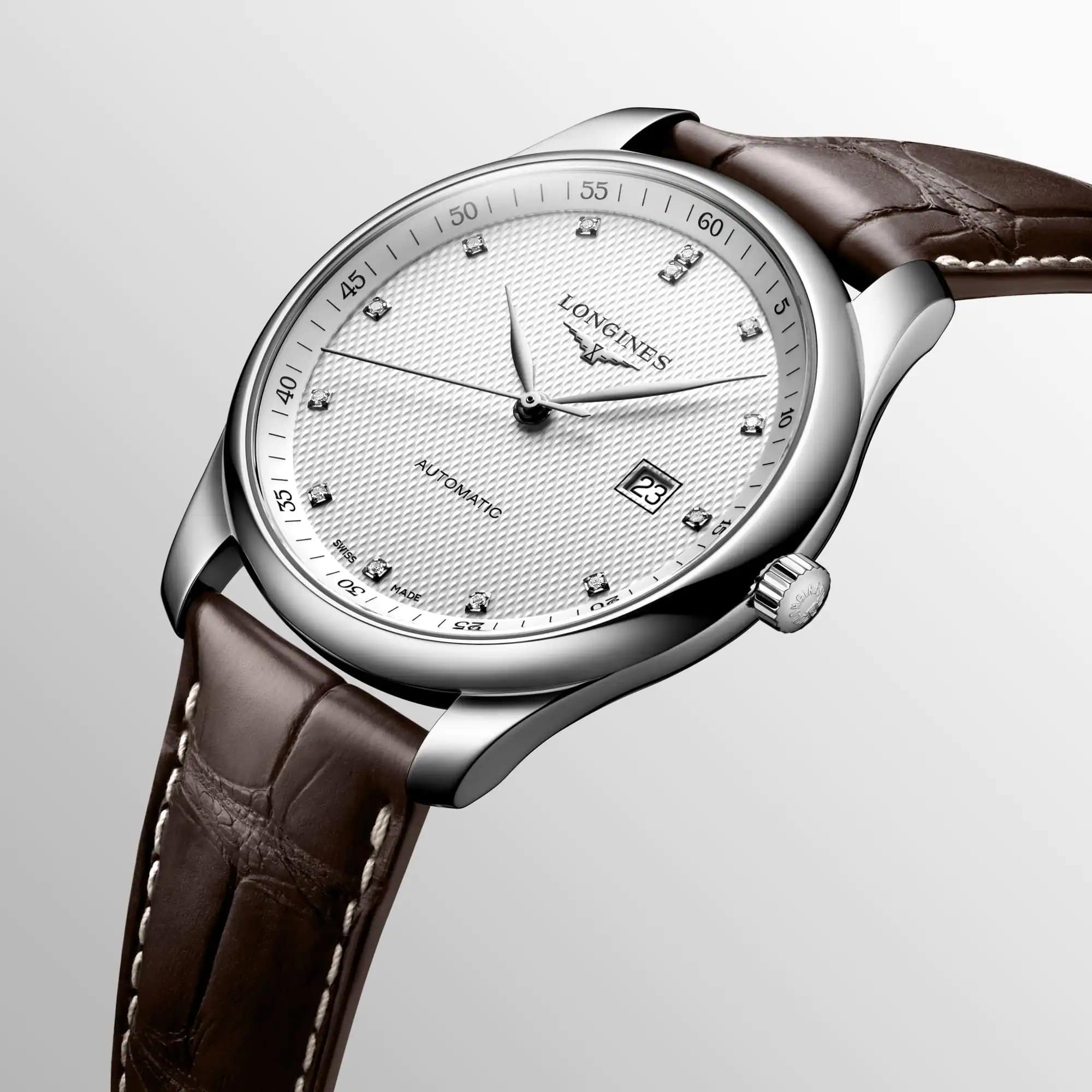 Швейцарские механические часы Longines Master Collection L2.893.4.77.3. Сапфировое стеклоСапфировое стеклоПрочный и надёжный материал из кристалла сапфира синтетического происхождения, характеризующийся особой твёрдостью и устойчивостью к царапинам и повреждениям. устойчивое к появлению царапин, обладающее высокой прозрачностью. Корпус часов изготовлен из нержавеющей стали. Циферблат с 13 бриллиантами группы Top Wesselton VS-SI общим весом 0.059 карата. Окошко даты в положении 3 часа. Автоматический механизм с частотой баланса 25 200 полуколебаний в час и запасом хода, которого хватает примерно на 72 часа работы. Класс водозащиты: 30 метров, позволит защитить корпус от случайных брызг или капель дождя. Ремешок из кожи аллигатора на застёжке «бабочка» с кнопкамиЗастёжка "бабочка"Такой вид застёжки дополняется предохранителями, помогающими избежать случайного раскрытия браслета. Обладают изящным исполнением. .