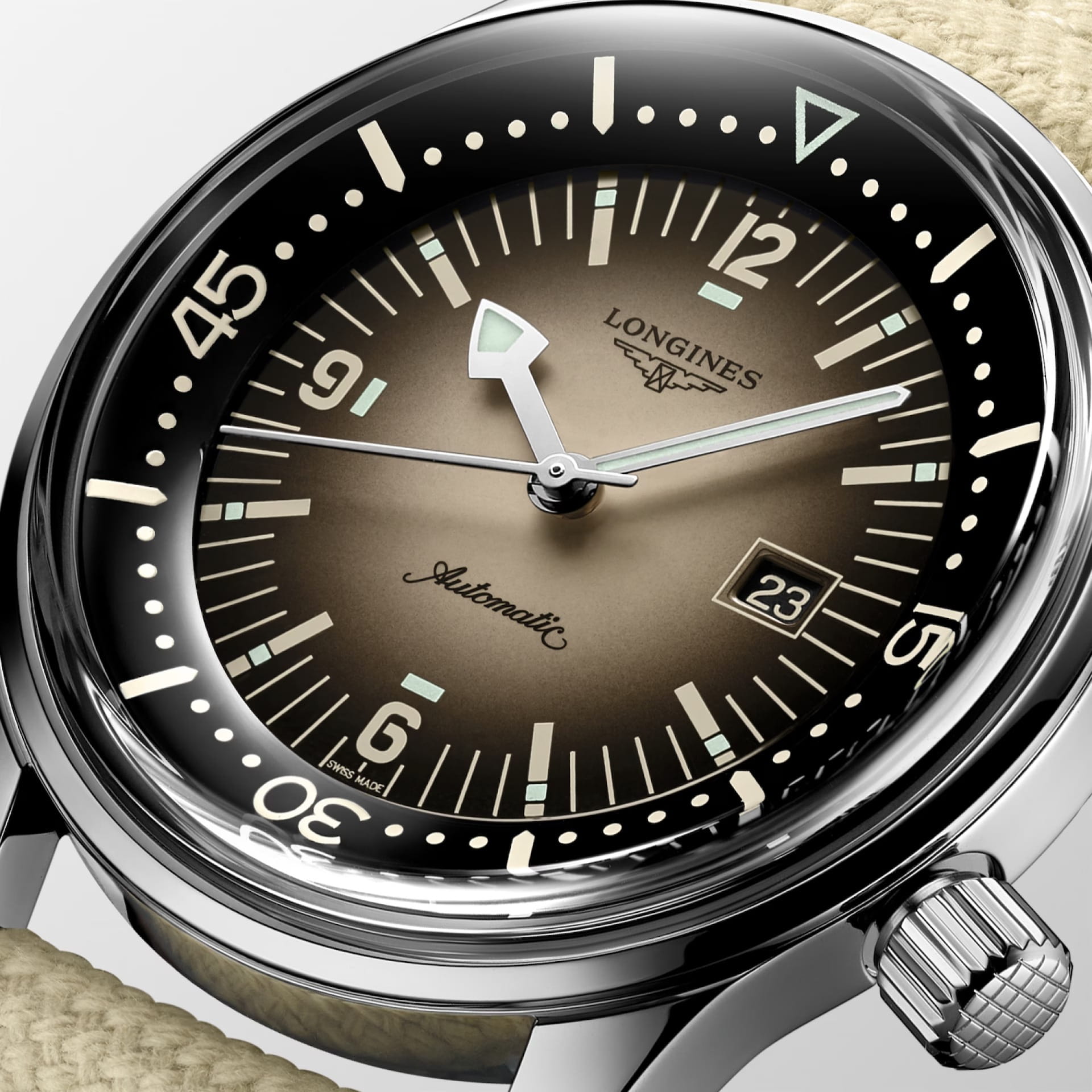 Швейцарские механические часы Longines The Longines Legend Diver Watch L3.374.4.30.2 – спортивный аксессуар в дайверском стиле. Циферблат отличается улучшенной читабельностью показателей благодаря крупной индикации времени, стрелками и метками с люминесцентной подсветкойЛюминесцентное покрытиеПозволяет считывать показания времени в темноте. Производители наносят на стрелки, часовые индексы, безель или поверхность циферблата светонакопительный состав, дающий холодное свечение., антибликовому покрытиюАнтибликовое покрытиеСлой оксида металла в 0,13-0,3 микрон, благодаря которому стекло часов не бликует и не отражает свет. Антибликовое покрытие уменьшает отражение света в 10 раз, обеспечивая отличную читаемость показателей циферблата. сапфирового стеклаСапфировое стеклоПрочный и надёжный материал из кристалла сапфира синтетического происхождения, характеризующийся особой твёрдостью и устойчивостью к царапинам и повреждениям.. Окошко даты находится в положении 3 часа. Швейцарский автоматический механизм L592 имеет запас хода на 45 часов. Ремешок из синтетической ткани на стандартной застёжке.