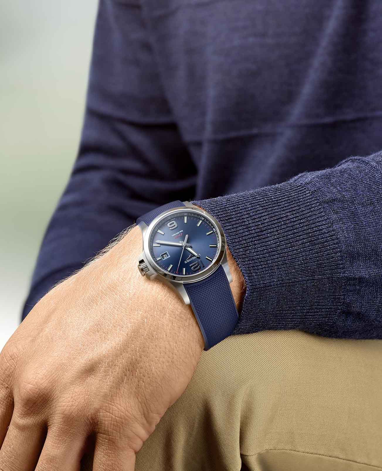 Синий каучуковый ремешок стильно смотрится на запястье. Швейцарский кварцевый механизм L288 демонстрирует абсолютную точность хода. Сапфировое стекло имеет антибликовое покрытие. Функции: вечный календарь, индикатор EOLEOLПредставляет собой систему, уведомляющую владельца часов о необходимости замены элемента питания. За 2 недели до полного разряда батарейки секундная стрелка перестаёт ходить чётко и начинает перепрыгивать на 3-4 деления..
