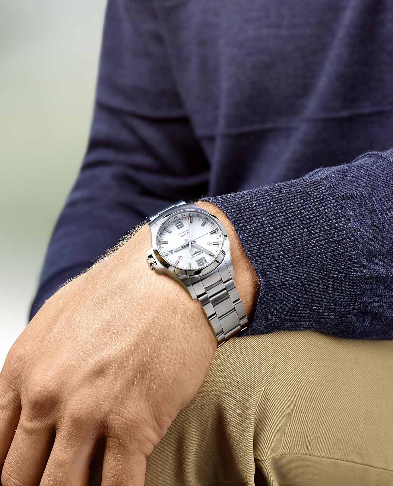 Серебристый браслет из нержавеющей стали стильно смотрится на запястье. Швейцарский кварцевый механизм L287 демонстрирует абсолютную точность хода. Устойчивое к царапинам сапфировое стекло имеет антибликовое покрытиеАнтибликовое покрытиеСлой оксида металла в 0,13-0,3 микрон, благодаря которому стекло часов не бликует и не отражает свет. Антибликовое покрытие уменьшает отражение света в 10 раз, обеспечивая отличную читаемость показателей циферблата. . Функции: вечный календарь, второй часовой пояс, индикатор EOLEOLПредставляет собой систему, уведомляющую владельца часов о необходимости замены элемента питания. За 2 недели до полного разряда батарейки секундная стрелка перестаёт ходить чётко и начинает перепрыгивать на 3-4 деления..