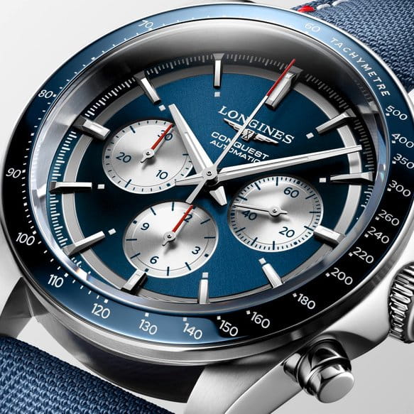 Мужские швейцарские механические часы- хронографХронографФункция позволяет измерять отрезки времени с особой точностью: часы, минуты, секунды. Верным признаком хронографа является наличие на циферблате 3 дополнительных окошек-счётчиков. Longines Conquest L3.835.4.91.2. Сапфировое стеклоСапфировое стеклоПрочный и надёжный материал из кристалла сапфира синтетического происхождения, характеризующийся особой твёрдостью и устойчивостью к царапинам и повреждениям. с многослойным антибликовым покрытием с обеих сторон, устойчивое к появлению царапин, обладающее высокой прозрачностью. Корпус часов изготовлен из стали. Неподвижный безельБезельВнешний ободок, закрепляющий стекло. В спортивных часах так называется поворотное кольцо с делениями на циферблате, выполняет роль таймера – замеряет отрезки времени на шкале. Неподвижный безель – элемент декора. Однонаправленно вращающийся безель на дайверских часах позволяет фиксировать моменты погружения и выныривания на поверхность. из стали и керамики, защищенный от царапин, никогда не изнашивается и не выцветает. Шкала тахиметраТахиметрРазмеченная шкала, располагается на ободке или безеле часов. Тахиметр позволяет рассчитать скорость на определённом участке пути, расстояние измеряется в километрах или милях.. На циферблате расположены три дополнительных циферблата. Стрелки и метки с люминесцентным покрытиемЛюминесцентное покрытиеПозволяет считывать показания времени в темноте. Производители наносят на стрелки, часовые индексы, безель или поверхность циферблата светонакопительный состав, дающий холодное свечение.. Класс водозащиты: 100 метров, позволит плавать, нырять и заниматься другими водными видами спорта. Тканевый ремешок на раскладной застёжкеРаскладная застёжкаТакой тип застёжки используется только на браслетах из металла. Она никогда не раскрывается полностью, происходит разделение на 2 и более частей. Раскладывающая застёжка снизит вероятность потери часов к минимуму.. Лимитированная серия.
