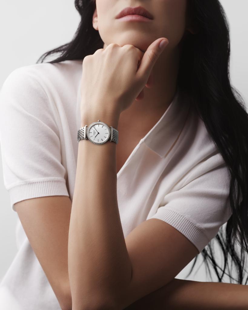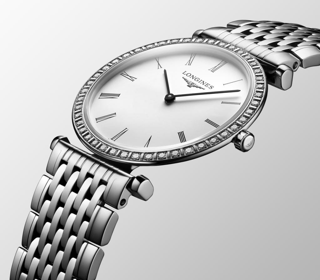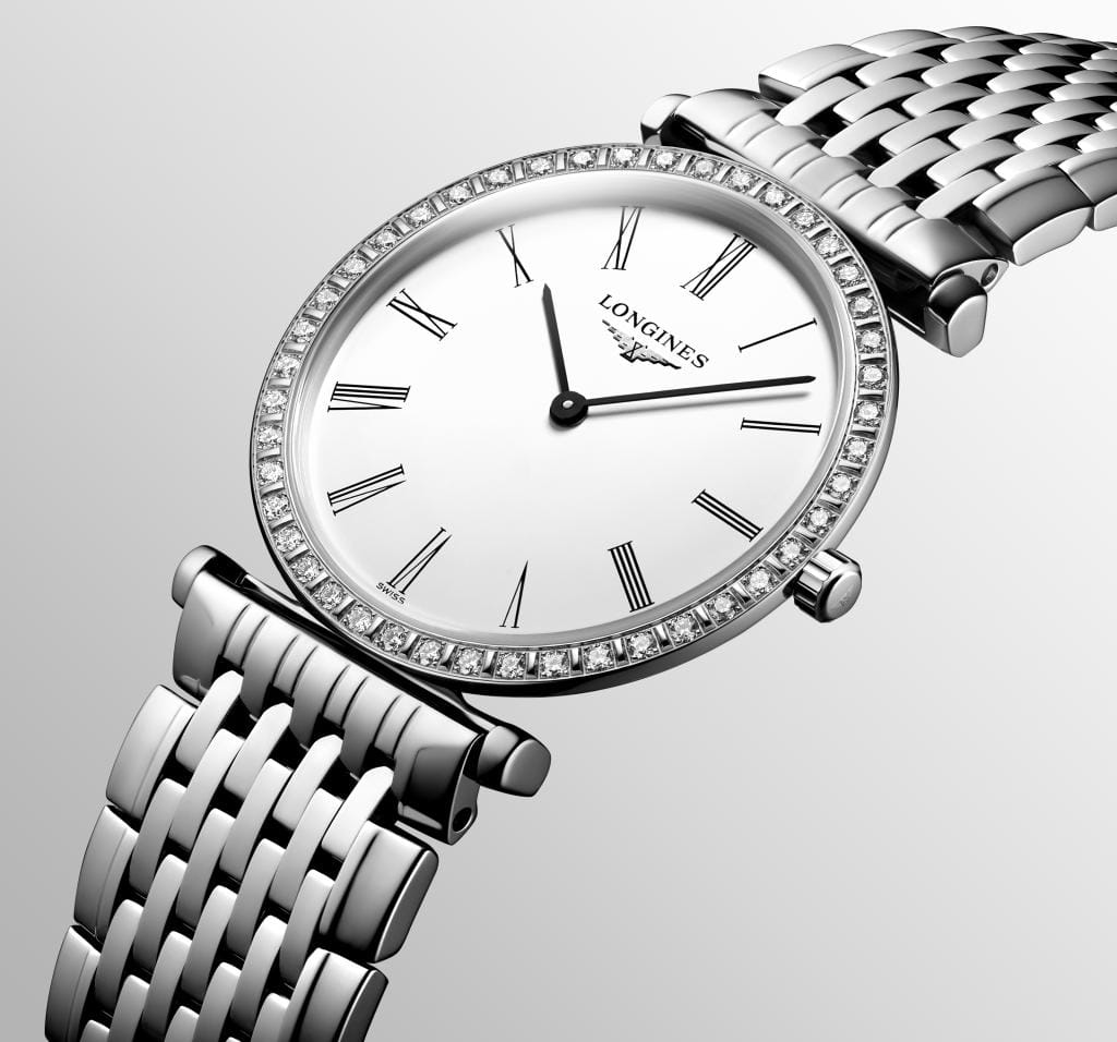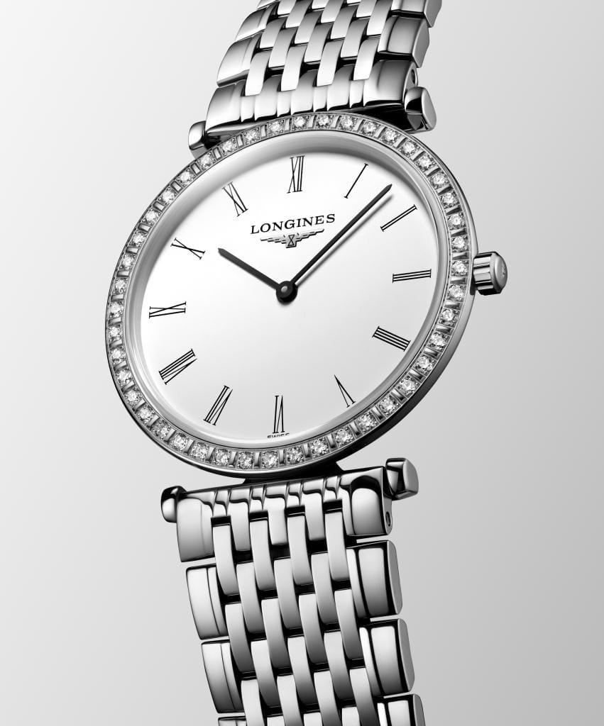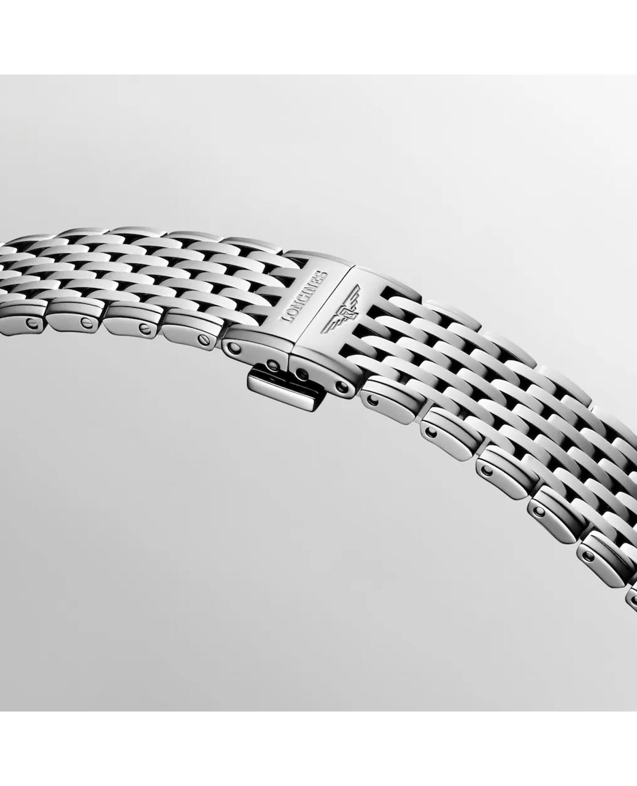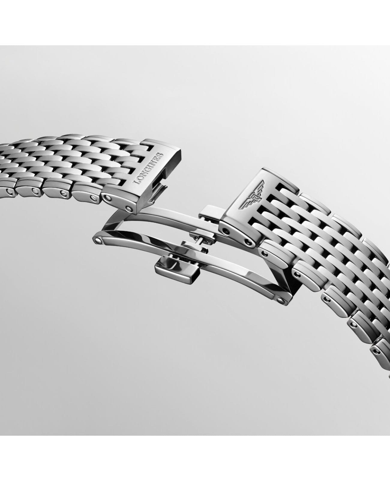Женские швейцарские часы Longines La Grande Classique L4.523.0.11.6, кварцевый механизм с высокой точностью. Сапфировое стеклоСапфировое стеклоПрочный и надёжный материал из кристалла сапфира синтетического происхождения, характеризующийся особой твёрдостью и устойчивостью к царапинам и повреждениям. устойчивое к появлению царапин, обладающее высокой прозрачностью. Корпус часов изготовлен из стали. БезельБезельВнешний ободок, закрепляющий стекло. В спортивных часах так называется поворотное кольцо с делениями на циферблате, выполняет роль таймера – замеряет отрезки времени на шкале. Неподвижный безель – элемент декора. Однонаправленно вращающийся безель на дайверских часах позволяет фиксировать моменты погружения и выныривания на поверхность. часов декорирован 44 бриллиантами общим весом 0.369 карата. Циферблат украшают нарисованные римские цифры. Класс водозащиты: 30 метров, позволит защитить корпус от случайных брызг или капель дождя. Стальной браслет на застёжке-бабочке с кнопкамиЗастёжка "бабочка"Такой вид застёжки дополняется предохранителями, помогающими избежать случайного раскрытия браслета. Обладают изящным исполнением. .