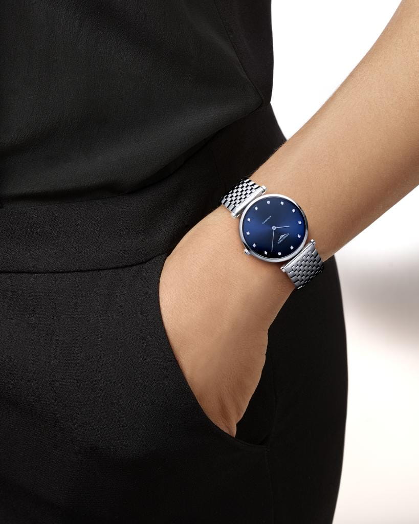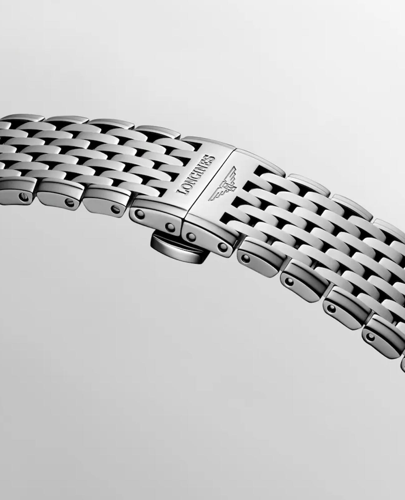 Женские швейцарские часы Longines La Grande Classique L4.908.4.97.6, кварцевый механизм с высокой точностью. Сапфировое стеклоСапфировое стеклоПрочный и надёжный материал из кристалла сапфира синтетического происхождения, характеризующийся особой твёрдостью и устойчивостью к царапинам и повреждениям. устойчивое к появлению царапин, обладающее высокой прозрачностью. Корпус часов изготовлен из стали. Циферблат с 12 бриллиантами группы Top Wesselton VS-SI общим весом 0.081 карата. Класс водозащиты: 30 метров, позволит защитить корпус от случайных брызг или капель дождя. Стальной браслет на застёжке-бабочке с кнопкамиЗастёжка "бабочка"Такой вид застёжки дополняется предохранителями, помогающими избежать случайного раскрытия браслета. Обладают изящным исполнением. .