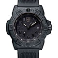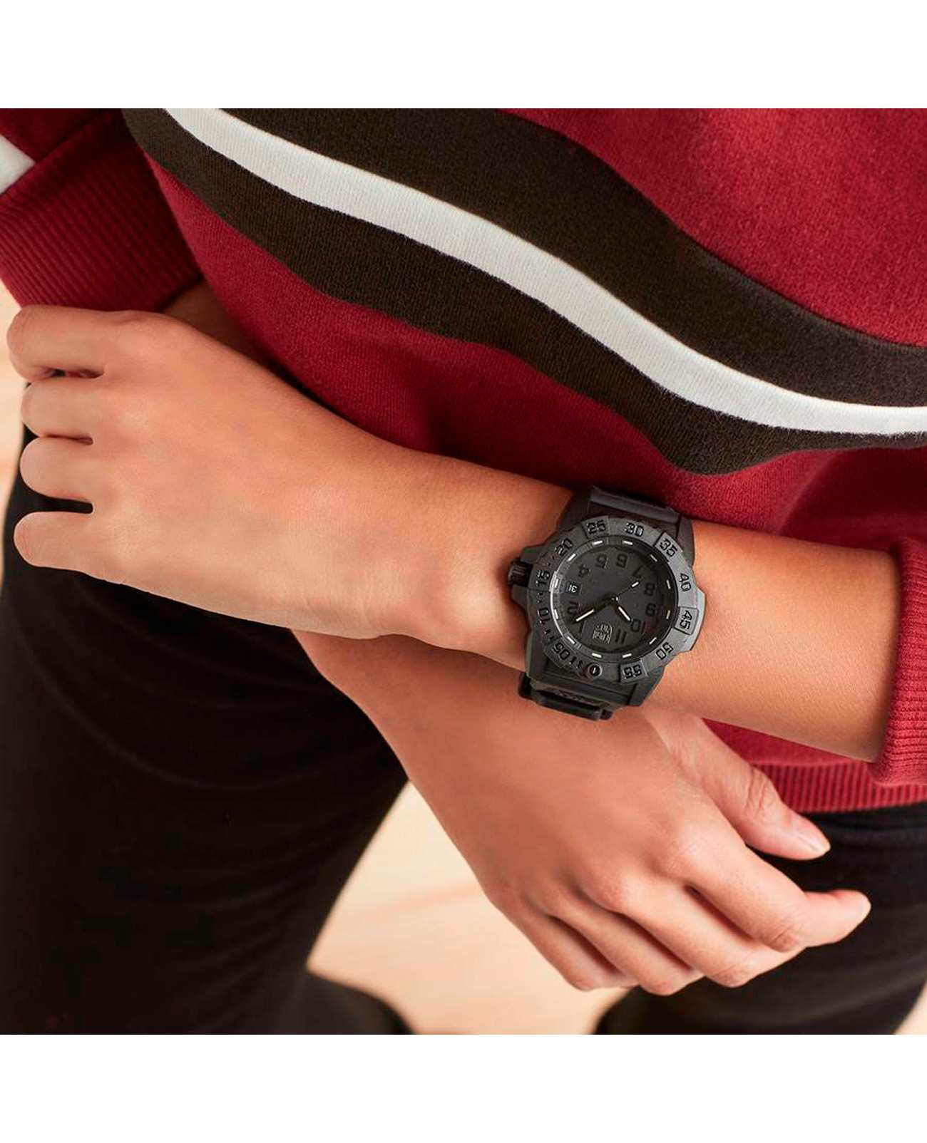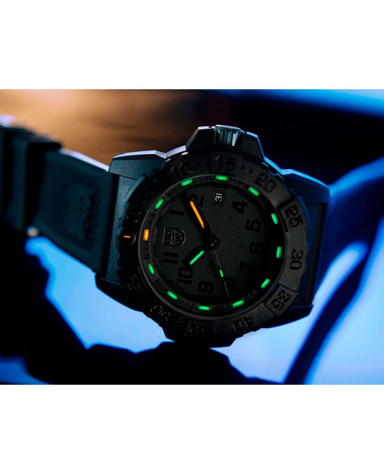 Мужские наручные часы Luminox XS.3501.BO.F из коллекции Navy SEAL сочетают в себе спортивный дизайн и надежность швейцарского качества . Модель обладает круглым корпусом диаметром 43 мм, изготовленным из карбонаКарбонОт «carbon», «carbone» - углерод, углепластик - полимерный композиционный материал из переплетённых под определенным углом между собой нитей углеродного волокна, применяется для изготовления лёгких, но прочных деталей. В часах часто используют для украшения циферблатов и ремешков. Так же карбон используется в изготовлении корпусов. Такие корпуса обладают антикоррозионным свойством, не поддаются электромагнитному излучению, обладают повышенной прочностью и противоударностью. (CARBONOX™), что обеспечивает высокую устойчивость к внешним воздействиям при сохранении легкости . Циферблат черного цвета украшен контрастными метками и стрелками с люминесцентным покрытиемЛюминесцентное покрытиеПозволяет считывать показания времени в темноте. Производители наносят на стрелки, часовые индексы, безель или поверхность циферблата светонакопительный состав, дающий холодное свечение., гарантирующим постоянную видимость времени даже в условиях низкой освещенности благодаря системе LLTLLTLLT — это автономный механизм подсветки, основанный на использовании микроскопических газонаполненных элементов. Специальные герметичные капсулы из боросиликатного стекла, интегрированные в циферблат, генерируют свечение без необходимости подключения к внешним источникам энергии. Для их работы не требуется ни дополнительный свет, ни механическое воздействие (например, нажатие кнопки). Свечение возникает благодаря химическому процессу: реакция между тритием, заключенным в капсулах, и люминофорным покрытием создает стабильное автономное освещение. Технология обеспечивает энергетическую независимость и долговечность подсветки. (микрогазовые огни) . Часы оснащены кварцевым механизмом швейцарского производства Ronda 715, обеспечивающим точность хода ±15 секунд в месяц . Защиту циферблата обеспечивает прочное минеральное стеклоМинеральное стеклоМинеральное стекло представляет собой искусственно выращенный минерал кварца. Такое стекло отличается особой устойчивостью к повреждениям и царапинам. Уступает по некоторым качествам сапфировому стеклу. с антибликовым покрытиемАнтибликовое покрытиеСлой оксида металла в 0,13-0,3 микрон, благодаря которому стекло часов не бликует и не отражает свет. Антибликовое покрытие уменьшает отражение света в 10 раз, обеспечивая отличную читаемость показателей циферблата., устойчивое к царапинам и механическим повреждениям . Водонепроницаемость модели достигает 20 атмосфер (200 метров), что делает их подходящими для плавания и активного отдыха на воде, включая дайвинг . Модель также оснащена безелемБезельВнешний ободок, закрепляющий стекло. В спортивных часах так называется поворотное кольцо с делениями на циферблате, выполняет роль таймера – замеряет отрезки времени на шкале. Неподвижный безель – элемент декора. Однонаправленно вращающийся безель на дайверских часах позволяет фиксировать моменты погружения и выныривания на поверхность. с односторонним вращением, что добавляет функциональности при использовании в водных условиях . Ремешок выполнен из черного полиуретана, что обеспечивает комфортное ношение 