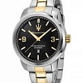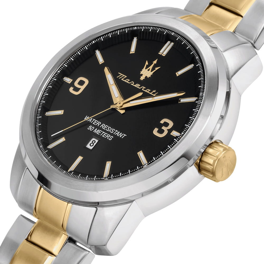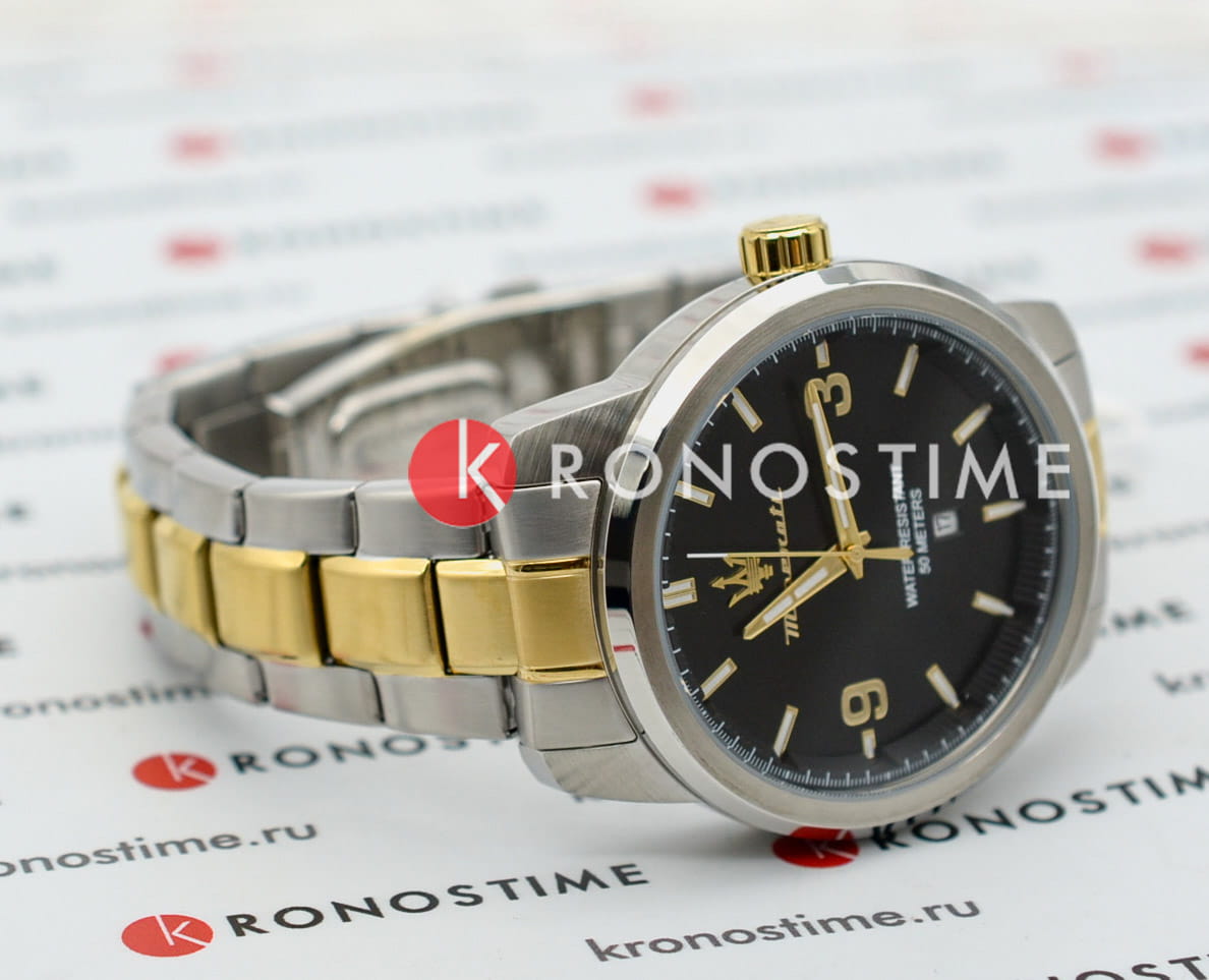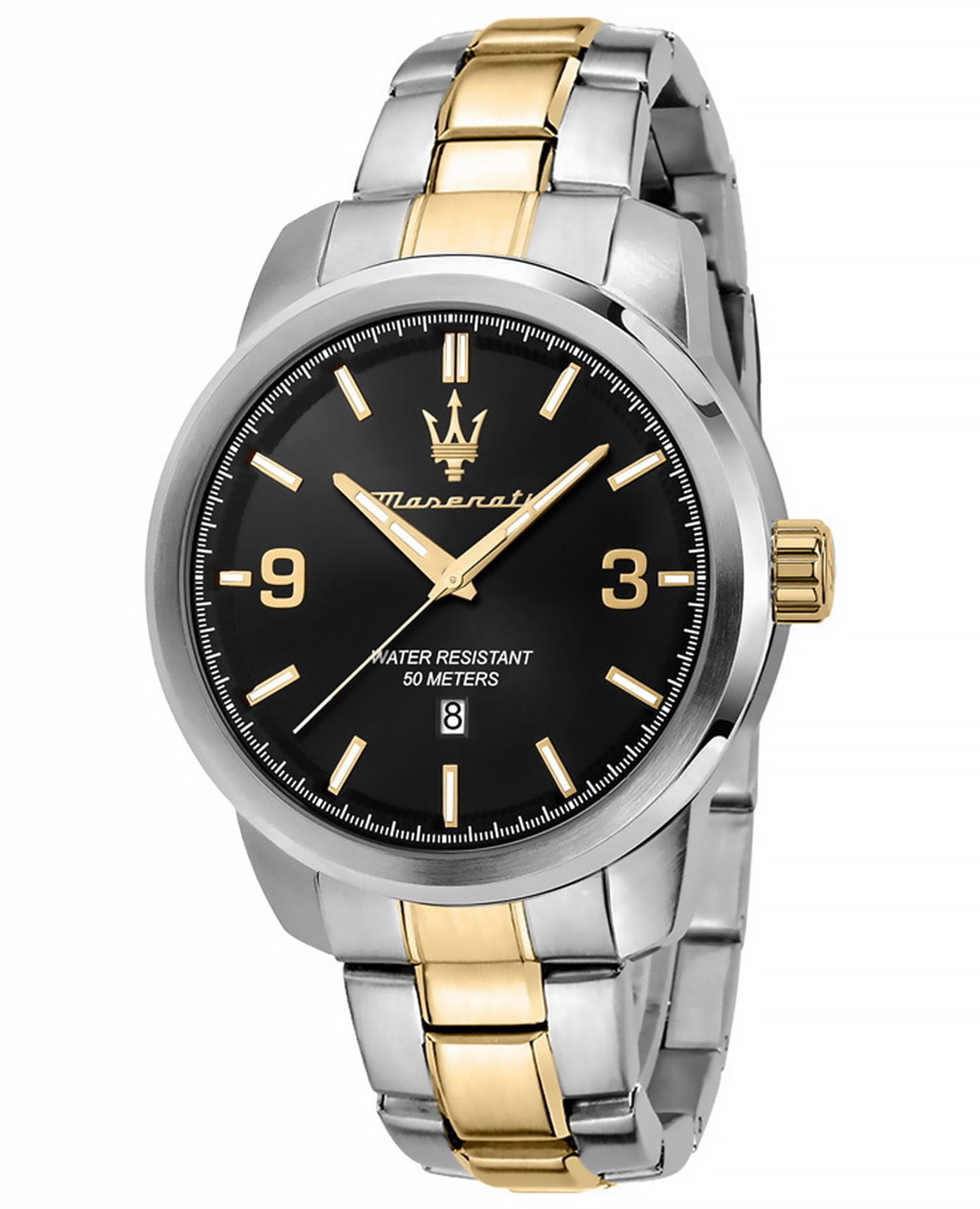 Мужские наручные часы Maserati R8853121009, кварцевый механизм (автоматический калибр) с высокой точностью. Минеральное стеклоМинеральное стеклоМинеральное стекло представляет собой искусственно выращенный минерал кварца. Такое стекло отличается особой устойчивостью к повреждениям и царапинам. Уступает по некоторым качествам сапфировому стеклу. устойчивое к появлению царапин, обладающее высокой прозрачностью. Стрелки с люминесцентным покрытиемЛюминесцентное покрытиеПозволяет считывать показания времени в темноте. Производители наносят на стрелки, часовые индексы, безель или поверхность циферблата светонакопительный состав, дающий холодное свечение.. Класс водозащиты: 50 метров, позволит защитить корпус от случайных брызг или капель дождя. Корпус часов изготовлен из нержавеющей стали. Браслет с раскладной застёжкойРаскладная застёжкаТакой тип застёжки используется только на браслетах из металла. Она никогда не раскрывается полностью, происходит разделение на 2 и более частей. Раскладывающая застёжка снизит вероятность потери часов к минимуму. и с PVD-покрытиемPVDУльтратонкое покрытие наносится в технике вакуумного напыления, сочетает в себе нитрид титана особой прочности со слоем золота или оксида хрома. Несёт в себе декоративную или защитную функцию..