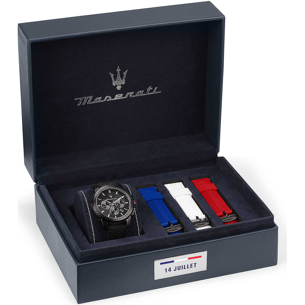 Мужские наручные часы Maserati R8871648006, кварцевый механизм (автоматический калибр) с высокой точностью. 3 дополнительных ремешка в комплекте. Минеральное стеклоМинеральное стеклоМинеральное стекло представляет собой искусственно выращенный минерал кварца. Такое стекло отличается особой устойчивостью к повреждениям и царапинам. Уступает по некоторым качествам сапфировому стеклу. устойчивое к появлению царапин, обладающее высокой прозрачностью. Стрелки с люминесцентным покрытиемЛюминесцентное покрытиеПозволяет считывать показания времени в темноте. Производители наносят на стрелки, часовые индексы, безель или поверхность циферблата светонакопительный состав, дающий холодное свечение.. Класс водозащиты: 50 метров, позволит защитить корпус от случайных брызг или капель дождя. Корпус часов изготовлен из нержавеющей стали с PVD-покрытиемPVDУльтратонкое покрытие наносится в технике вакуумного напыления, сочетает в себе нитрид титана особой прочности со слоем золота или оксида хрома. Несёт в себе декоративную или защитную функцию.. Ремешок с классической застежкой.
