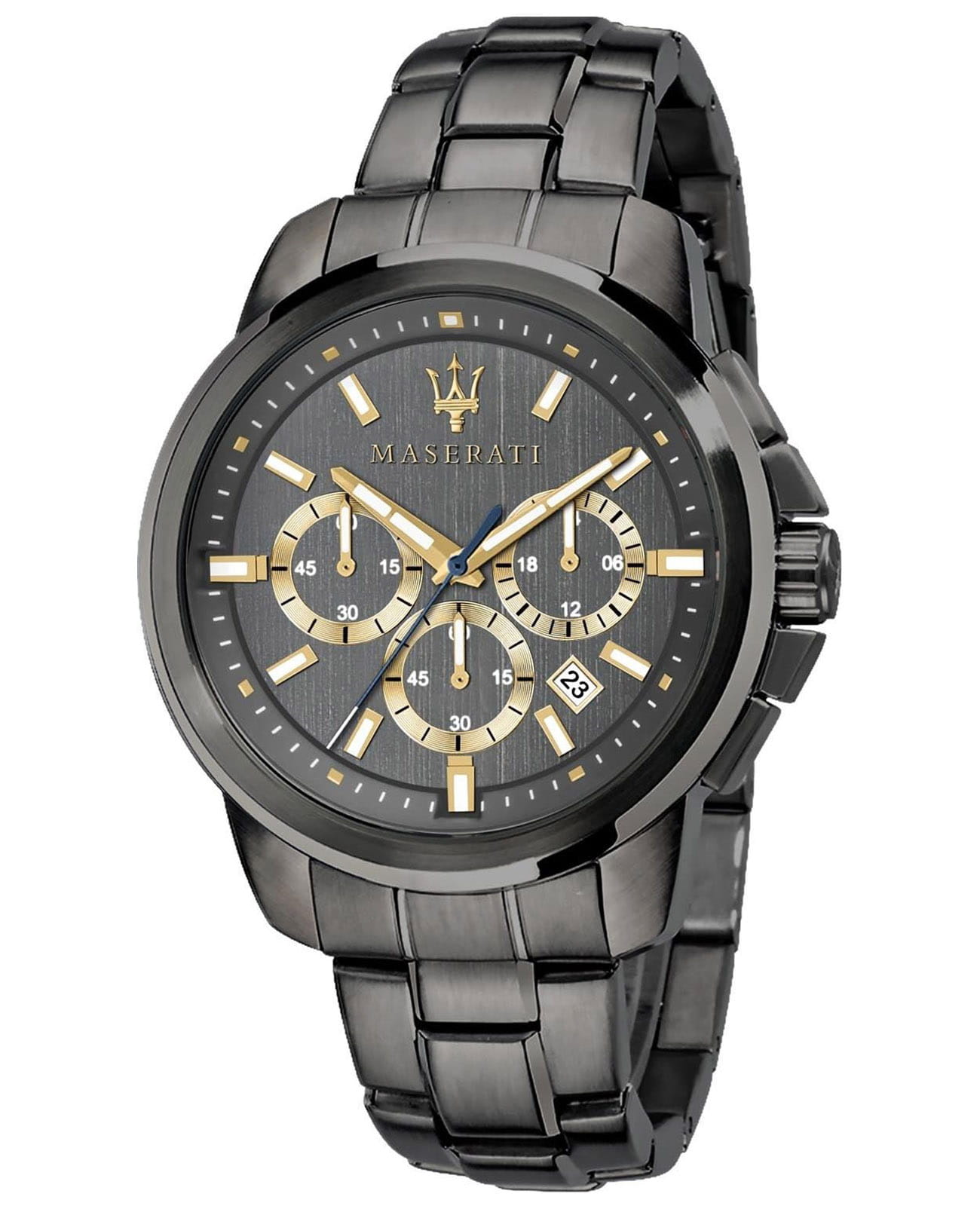 Мужские наручные часы-хронографХронографФункция позволяет измерять отрезки времени с особой точностью: часы, минуты, секунды. Верным признаком хронографа является наличие на циферблате 3 дополнительных окошек-счётчиков. Maserati R8873621007, кварцевый механизм (автоматический калибр) с высокой точностью. Минеральное стеклоМинеральное стеклоМинеральное стекло представляет собой искусственно выращенный минерал кварца. Такое стекло отличается особой устойчивостью к повреждениям и царапинам. Уступает по некоторым качествам сапфировому стеклу. устойчивое к появлению царапин, обладающее высокой прозрачностью. Стрелки с люминесцентным покрытиемЛюминесцентное покрытиеПозволяет считывать показания времени в темноте. Производители наносят на стрелки, часовые индексы, безель или поверхность циферблата светонакопительный состав, дающий холодное свечение.. Класс водозащиты: 50 метров, позволит защитить корпус от случайных брызг или капель дождя. Корпус часов изготовлен из нержавеющей стали с PVD-покрытиемPVDУльтратонкое покрытие наносится в технике вакуумного напыления, сочетает в себе нитрид титана особой прочности со слоем золота или оксида хрома. Несёт в себе декоративную или защитную функцию.. Браслет с раскладной застёжкойРаскладная застёжкаТакой тип застёжки используется только на браслетах из металла. Она никогда не раскрывается полностью, происходит разделение на 2 и более частей. Раскладывающая застёжка снизит вероятность потери часов к минимуму. и с PVD-покрытиемPVDУльтратонкое покрытие наносится в технике вакуумного напыления, сочетает в себе нитрид титана особой прочности со слоем золота или оксида хрома. Несёт в себе декоративную или защитную функцию..
