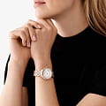 Женские американские часы с минеральным стекломМинеральное стеклоМинеральное стекло представляет собой искусственно выращенный минерал кварца. Такое стекло отличается особой устойчивостью к повреждениям и царапинам. Уступает по некоторым качествам сапфировому стеклу. Michael Kors Camille MK4810, кварцевый механизм с высокой точностью. Корпус часов изготовлен из стали с PVD-покрытиемPVDУльтратонкое покрытие наносится в технике вакуумного напыления, сочетает в себе нитрид титана особой прочности со слоем золота или оксида хрома. Несёт в себе декоративную или защитную функцию.. Браслет и безельБезельВнешний ободок, закрепляющий стекло. В спортивных часах так называется поворотное кольцо с делениями на циферблате, выполняет роль таймера – замеряет отрезки времени на шкале. Неподвижный безель – элемент декора. Однонаправленно вращающийся безель на дайверских часах позволяет фиксировать моменты погружения и выныривания на поверхность. украшены кристаллами. Метки в виде штрихов и римских цифр. Заводная головка с защитой. Класс водозащиты: 50 метров, позволит защитить корпус от случайных брызг или капель дождя. Стальной браслет с PVD-покрытиемPVDУльтратонкое покрытие наносится в технике вакуумного напыления, сочетает в себе нитрид титана особой прочности со слоем золота или оксида хрома. Несёт в себе декоративную или защитную функцию. на застёжке-бабочке с кнопкамиЗастёжка "бабочка"Такой вид застёжки дополняется предохранителями, помогающими избежать случайного раскрытия браслета. Обладают изящным исполнением. .