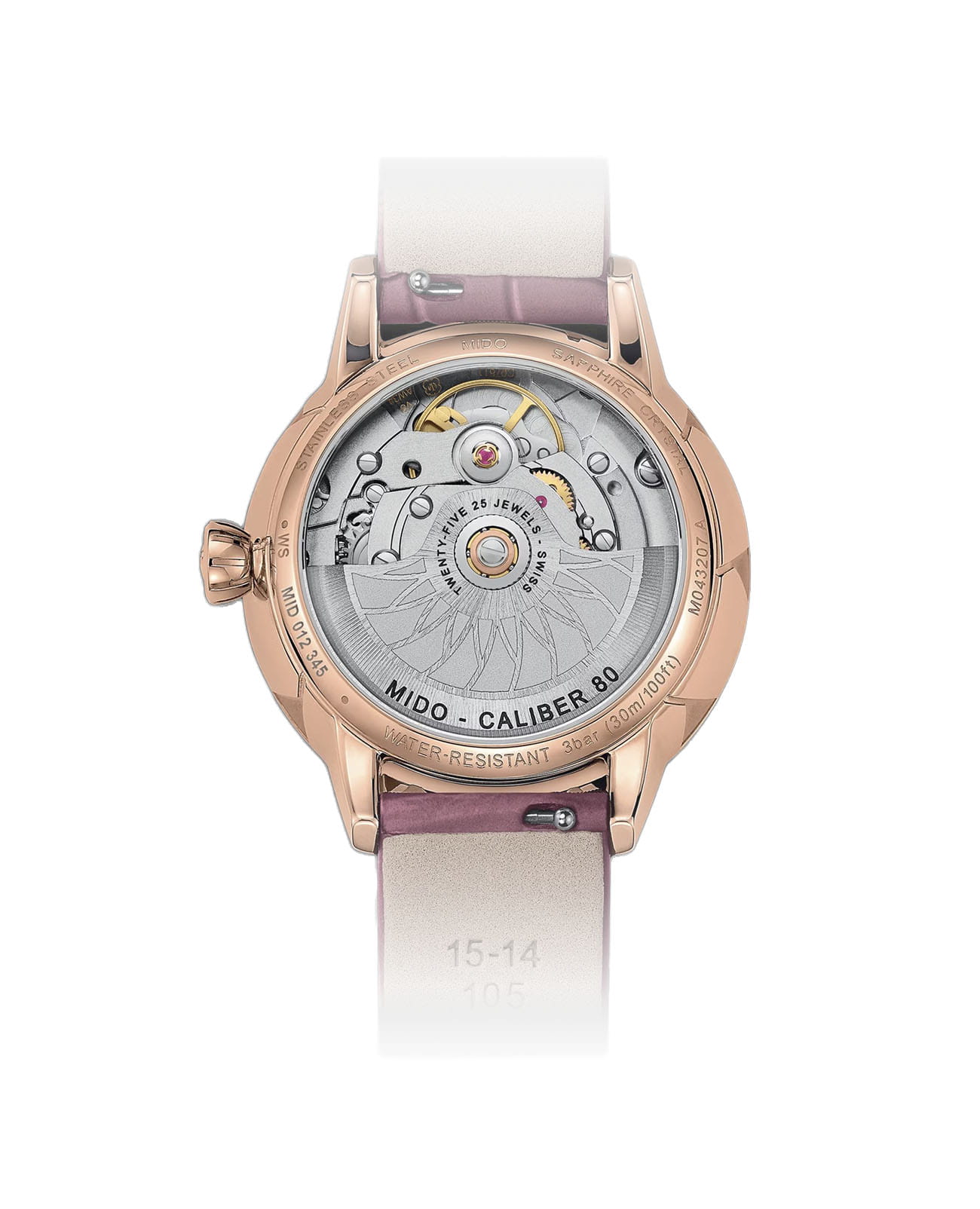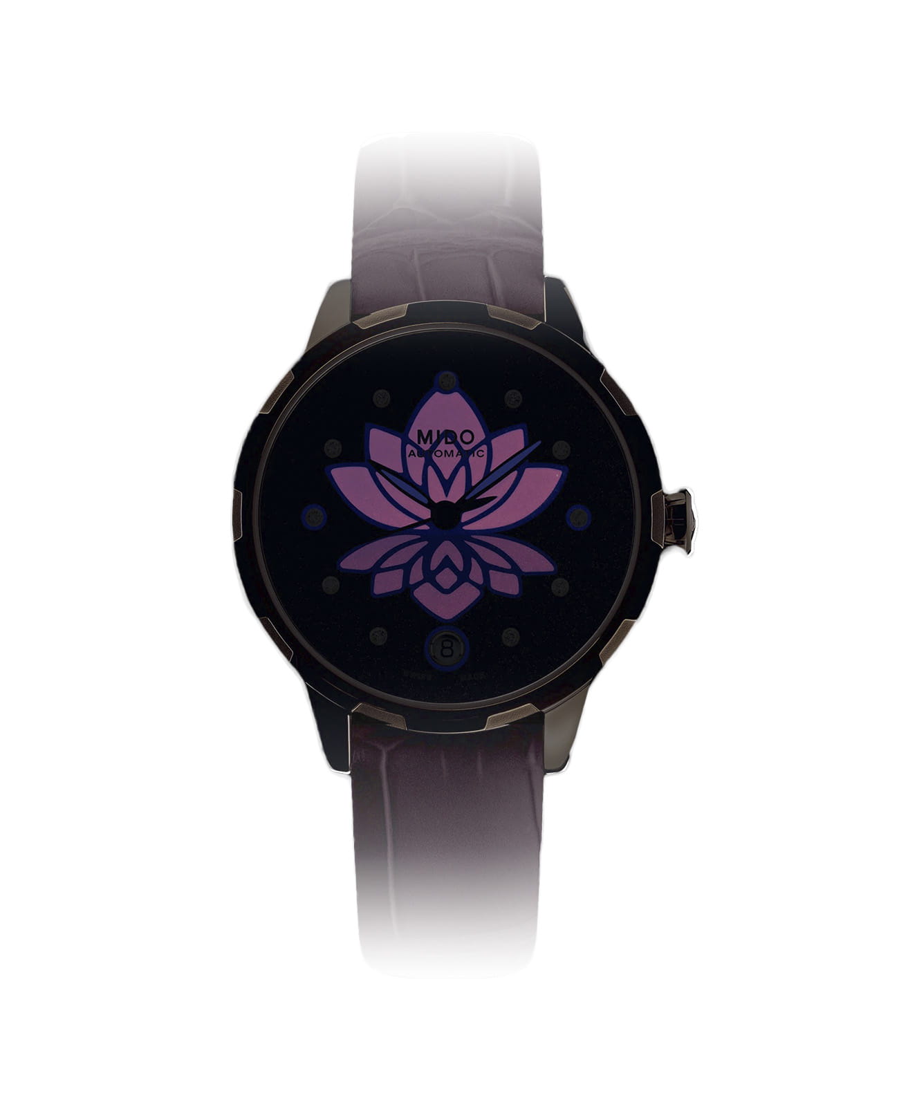 Изысканные и неброские, новые швейцарские механические часы для женщин Mido Rainflower Night M043.207.36.106.00, механический механизм (автоматический калибр) с высокой точностью. Сапфировое стеклоСапфировое стеклоПрочный и надёжный материал из кристалла сапфира синтетического происхождения, характеризующийся особой твёрдостью и устойчивостью к царапинам и повреждениям. устойчивое к появлению царапин, обладающее высокой прозрачностью. Корпус часов изготовлен из стали с PVDPVDУльтратонкое покрытие наносится в технике вакуумного напыления, сочетает в себе нитрид титана особой прочности со слоем золота или оксида хрома. Несёт в себе декоративную или защитную функцию. покрытием. Циферблат украшают метки с бриллиантами и гравивовка в виде цветка лотоса. Стрелки с люминесцентным покрытиемЛюминесцентное покрытиеПозволяет считывать показания времени в темноте. Производители наносят на стрелки, часовые индексы, безель или поверхность циферблата светонакопительный состав, дающий холодное свечение.. Окошко в положении 6 часов. Оснащенные автоматическим механизмом последнего поколения Calibre 80, часы Rainflower обеспечивают исключительную автономность с запасом хода до 80 часов. Класс водозащиты: 30 метров, позволит защитить корпус от случайных брызг или капель дождя. Кожаный ремешок на стандартной застежке.