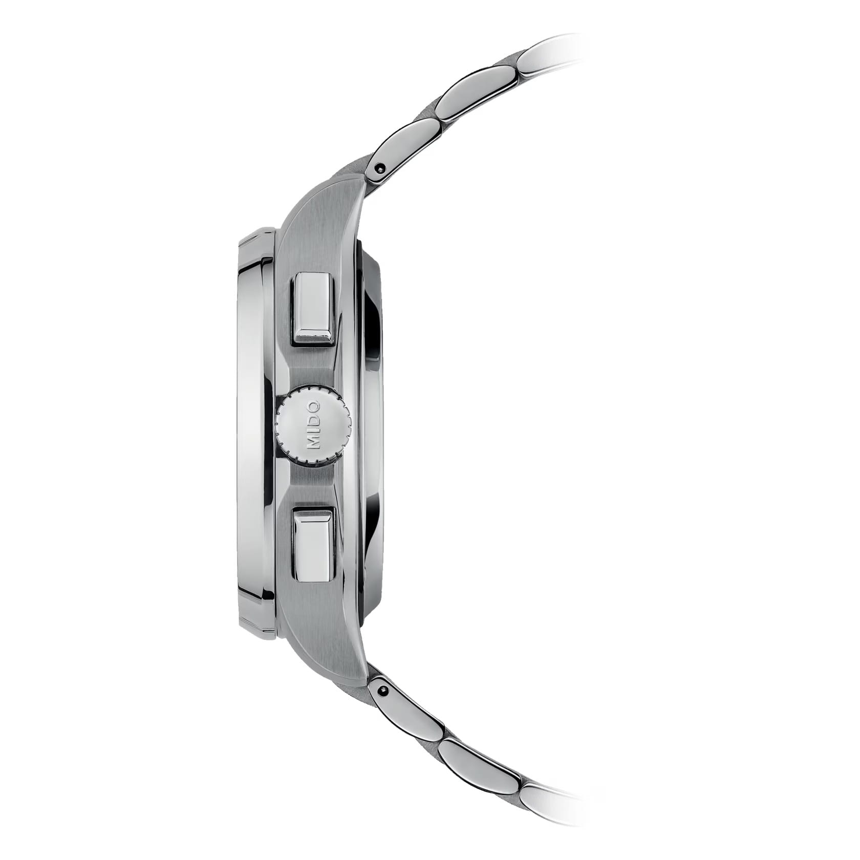 Мужские механические швейцарские часы Mido Multifort TV Chronograph M049.527.11.041.00, механический механизм с высокой точностью. Сапфировое стеклоСапфировое стеклоПрочный и надёжный материал из кристалла сапфира синтетического происхождения, характеризующийся особой твёрдостью и устойчивостью к царапинам и повреждениям. устойчивое к появлению царапин, обладающее высокой прозрачностью. Корпус часов изготовлен из нержавеющей стали.  В механизм внедрена пружина баланса Nivachron™Nivachron™Специально разработанный инновационный сплав Nivachron™ повышает устойчивость часов к воздействию магнитных полей.. Стрелки с люминесцентным покрытиемЛюминесцентное покрытиеПозволяет считывать показания времени в темноте. Производители наносят на стрелки, часовые индексы, безель или поверхность циферблата светонакопительный состав, дающий холодное свечение.. Окошко даты в положении между 4 и 6 часами. Класс водозащиты: 100 метров, позволит плавать, нырять и заниматься другими водными видами спорта. Стальной браслет на раскладной застёжкеРаскладная застёжкаТакой тип застёжки используется только на браслетах из металла. Она никогда не раскрывается полностью, происходит разделение на 2 и более частей. Раскладывающая застёжка снизит вероятность потери часов к минимуму..Часы с функциями хронографаХронографФункция позволяет измерять отрезки времени с особой точностью: часы, минуты, секунды. Верным признаком хронографа является наличие на циферблате 3 дополнительных окошек-счётчиков. и тахиметраТахиметрРазмеченная шкала, располагается на ободке или безеле часов. Тахиметр позволяет рассчитать скорость на определённом участке пути, расстояние измеряется в километрах или милях.. Поставляются с дополнительным ремешком, что обеспечивает еще большую универсальность и комфорт.