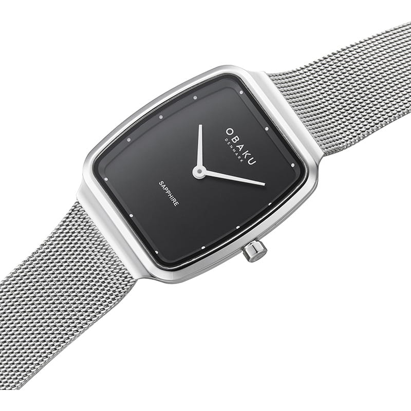 Женские наручные часы на миланском браслете Obaku Ultra Slim V267LXCBMC, кварцевый механизм с высокой точностью. Сапфировое стеклоСапфировое стеклоПрочный и надёжный материал из кристалла сапфира синтетического происхождения, характеризующийся особой твёрдостью и устойчивостью к царапинам и повреждениям. устойчивое к появлению царапин, обладающее высокой прозрачностью. Класс водозащиты: 30 метров, позволит защитить корпус от случайных брызг или капель дождя. Корпус часов изготовлен из стали. Черный циферблат с часовыми индексами в виде точек. Браслет миланского плетения выполнен из нержавеющей стали с раскладной застёжкойРаскладная застёжкаТакой тип застёжки используется только на браслетах из металла. Она никогда не раскрывается полностью, происходит разделение на 2 и более частей. Раскладывающая застёжка снизит вероятность потери часов к минимуму..