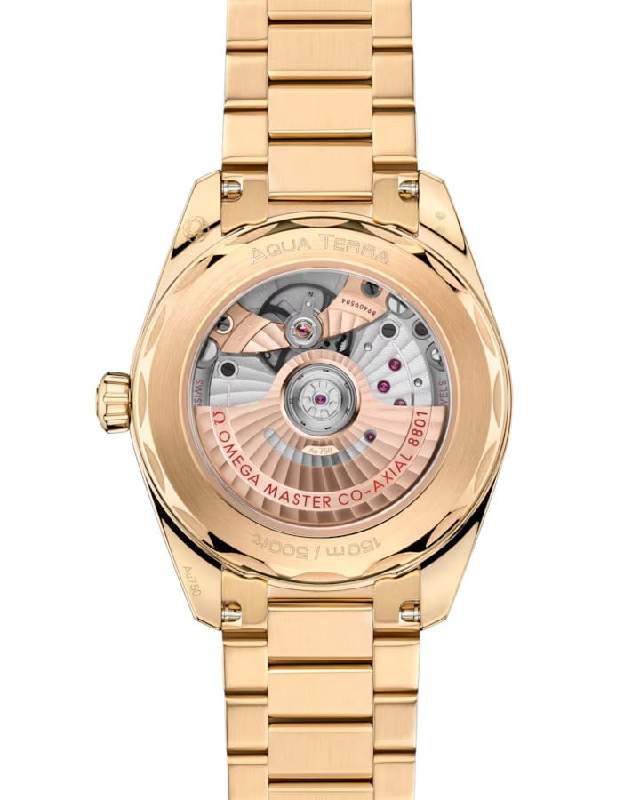 Omega Seamaster Aqua Terra выполнены в симметричном корпусе из 18K Moonshine™ золота с завинчивающейся задней крышкой, украшенной волновым узором. Циферблат дополнен окошком даты на 6 часах и оформлен в технике sun-brushed с PVD-покрытием, создающим мягкий металлический отлив. Стрелки и метки выполнены из 18K Moonshine™ золота и оснащены люминесцентным покрытиемЛюминесцентное покрытиеПозволяет считывать показания времени в темноте. Производители наносят на стрелки, часовые индексы, безель или поверхность циферблата светонакопительный состав, дающий холодное свечение. Super-LumiNova для лучшей читаемости в темноте. Индексы выполнены в форме корпусов парусников — деталь, подчёркивающая морское наследие коллекции. Калибр Omega 8801 сертифицирован как Master Chronometer — гарантия высочайшей точности и устойчивости к магнитным полям. Запас хода составляет 55 часов. Защиту циферблата обеспечивает сапфировое стеклоСапфировое стеклоПрочный и надёжный материал из кристалла сапфира синтетического происхождения, характеризующийся особой твёрдостью и устойчивостью к царапинам и повреждениям. с антибликовым покрытиемАнтибликовое покрытиеСлой оксида металла в 0,13-0,3 микрон, благодаря которому стекло часов не бликует и не отражает свет. Антибликовое покрытие уменьшает отражение света в 10 раз, обеспечивая отличную читаемость показателей циферблата. с обеих сторон. Водозащита позволяет использовать часы в воде без риска повреждения. Часы установлены на браслет из 18K Moonshine™ золота. Это сочетание премиального качества, технологичности и классического дизайна.