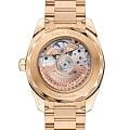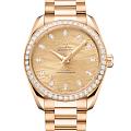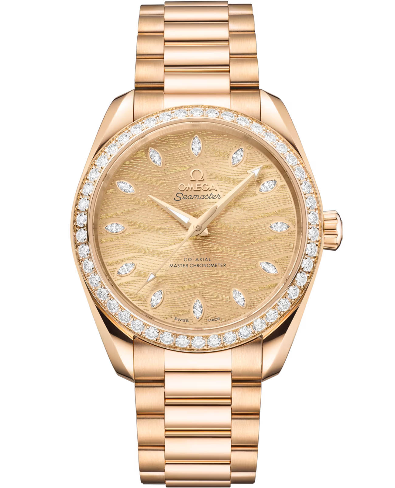 Omega Seamaster Aqua Terra выполнены в симметричном корпусе из полированного 18K Moonshine™ золота с завинчивающейся задней крышкой, украшенной волновым узором. Безель инкрустирован бриллиантами, что добавляет модели роскошный акцент. Циферблат дополнен окошком даты и оформлен уникальным волновым рисунком, созданным методом wire bonding — технологией, используемой в микроэлектронике. Основа циферблата изготовлена из 18K золота и покрыта PVD для стойкости цвета. Часовые метки представлены бриллиантами, а стрелки выполнены из 18K Moonshine™ золота и оснащены люминесцентным покрытиемЛюминесцентное покрытиеПозволяет считывать показания времени в темноте. Производители наносят на стрелки, часовые индексы, безель или поверхность циферблата светонакопительный состав, дающий холодное свечение. Super-LumiNova для лучшей читаемости в темноте. Калибр Omega 8807 сертифицирован как Master Chronometer — гарантия высочайшей точности и устойчивости к магнитным полям. Запас хода составляет 55 часов. Защиту циферблата обеспечивает сапфировое стеклоСапфировое стеклоПрочный и надёжный материал из кристалла сапфира синтетического происхождения, характеризующийся особой твёрдостью и устойчивостью к царапинам и повреждениям. с антибликовым покрытиемАнтибликовое покрытиеСлой оксида металла в 0,13-0,3 микрон, благодаря которому стекло часов не бликует и не отражает свет. Антибликовое покрытие уменьшает отражение света в 10 раз, обеспечивая отличную читаемость показателей циферблата. с обеих сторон. Водозащита позволяет использовать часы в воде без риска повреждения. Часы установлены на браслет из 18K Moonshine™ золота с закруглёнными звеньями и раскладной застёжкойРаскладная застёжкаТакой тип застёжки используется только на браслетах из металла. Она никогда не раскрывается полностью, происходит разделение на 2 и более частей. Раскладывающая застёжка снизит вероятность потери часов к минимуму.. Это сочетание премиального качества, технологичности и классического дизайна.