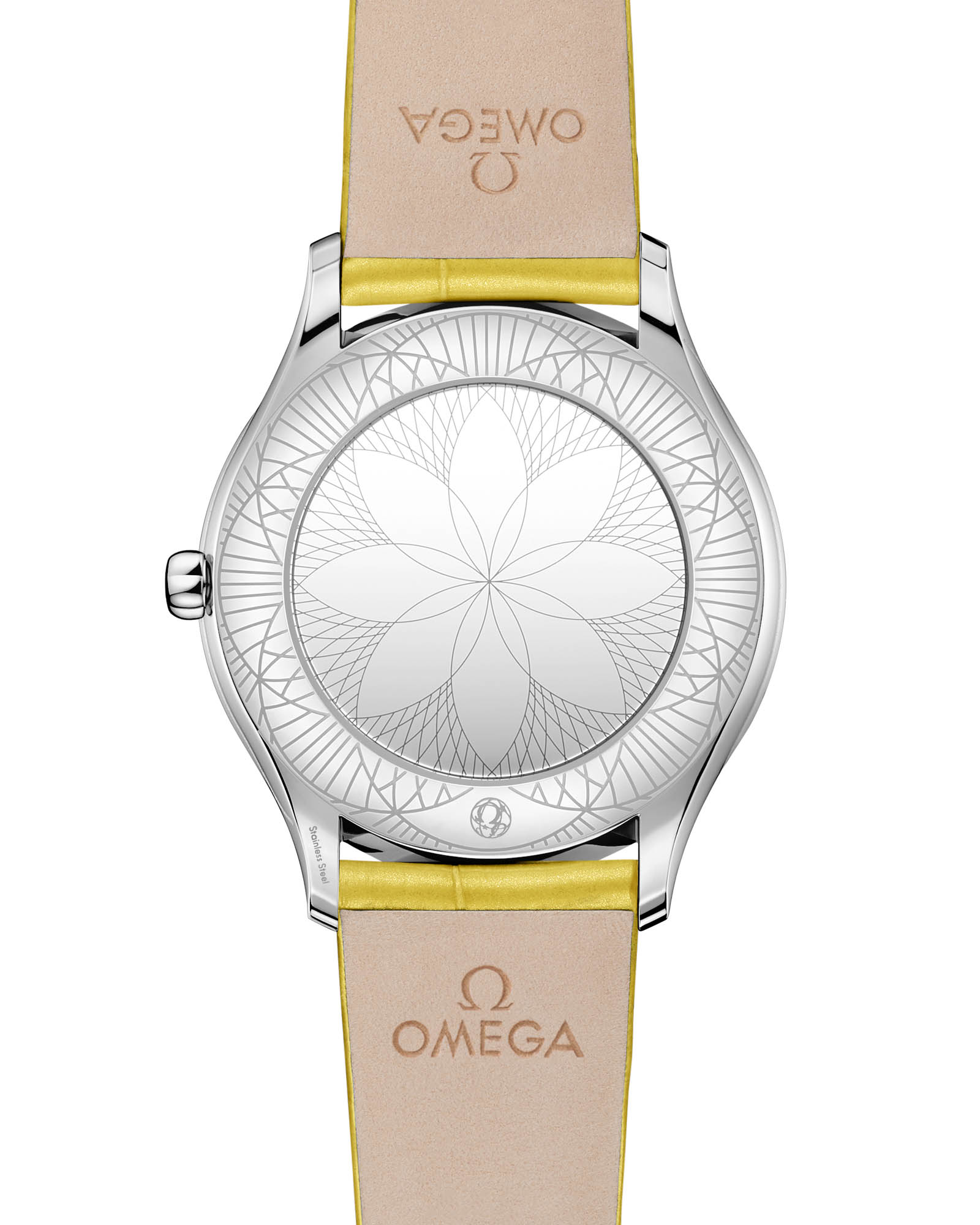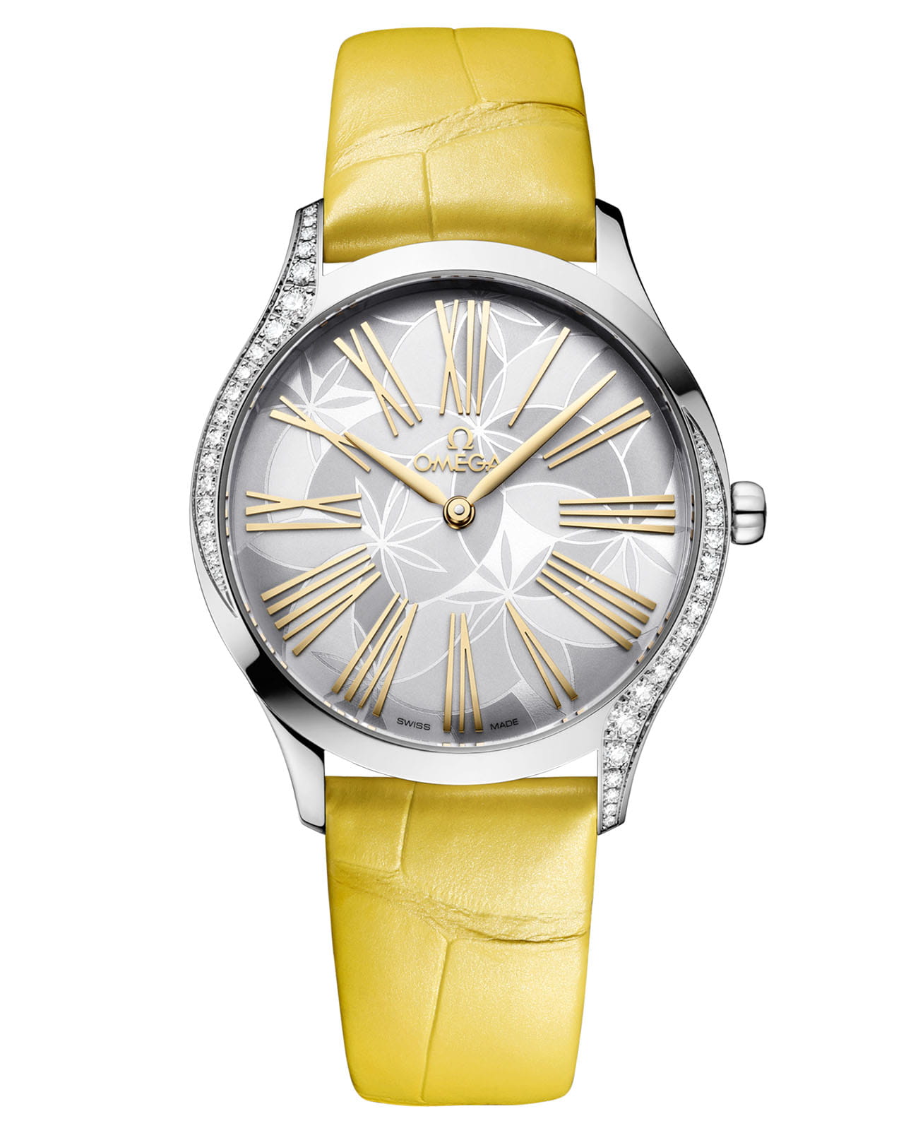 OMEGA Trésor в цветочном вдохновении — это симфония роскоши и природной гармонии. 36-мм корпус из полированной нержавеющей стали, усыпанный 38 бриллиантами (0,49 карата), сверкает как утренняя роса. Под выпуклым сапфировым стекломСапфировое стеклоПрочный и надёжный материал из кристалла сапфира синтетического происхождения, характеризующийся особой твёрдостью и устойчивостью к царапинам и повреждениям. раскрывается серебристый циферблат с пескоструйной отделкой и нежным узором плюмерии, созданным лазерной гравировкой. Заводная головка с бриллиантом и элементы из золота Moonshine™18-каратное золотоОбозначение по каратной системе пробирования, оно показывает, сколько драгоценного металла содержится в изделии. 18 карат - в составе 75% чистого золота, соответствует 750 пробе.