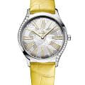 с PVD-покрытиемPVDУльтратонкое покрытие наносится в технике вакуумного напыления, сочетает в себе нитрид титана особой прочности со слоем золота или оксида хрома. Несёт в себе декоративную или защитную функцию. добавляют благородный блеск. Желтый кожаный ремешок с металлической застежкой завершает образ, а зеркальная крышка с узором "Her Time" скрывает точный кварцевый механизм OMEGA 4061 — воплощение изысканности и часового мастерства.