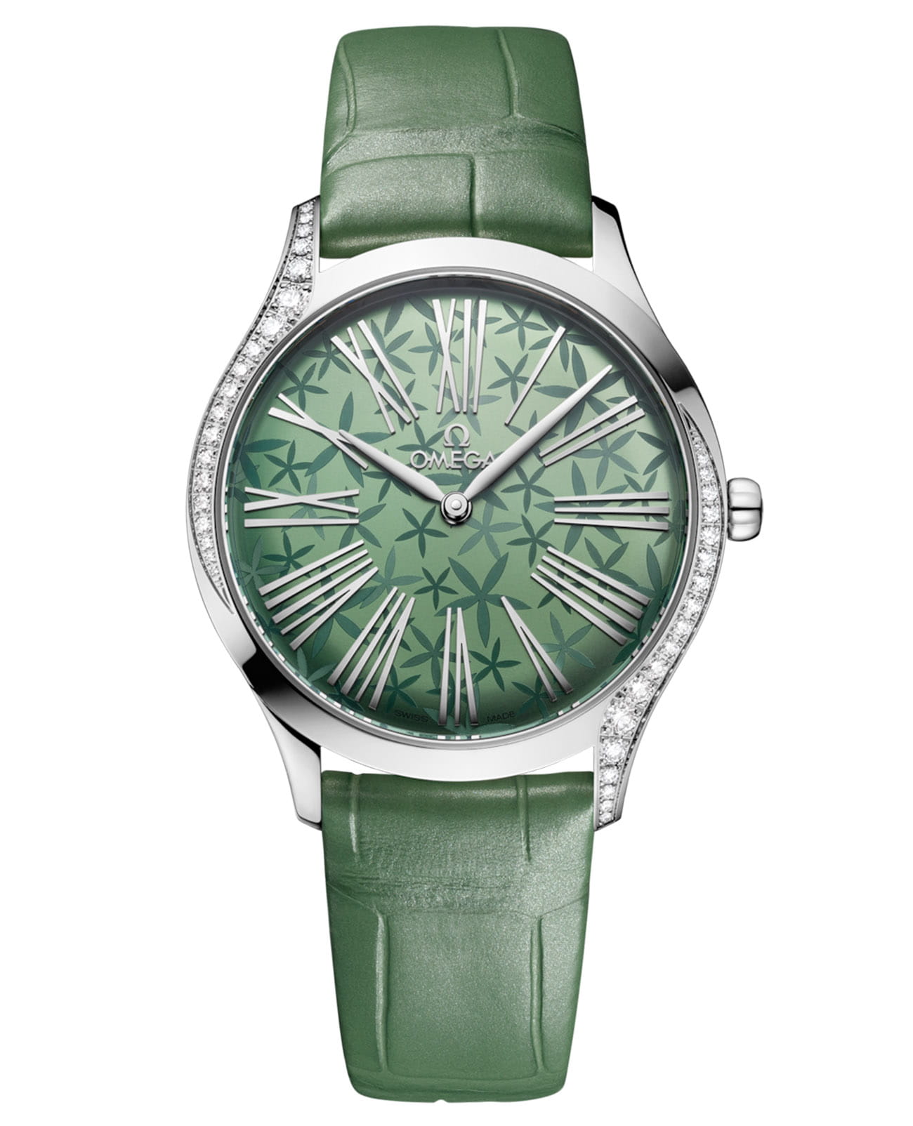 OMEGA Trésor с цветочным вдохновением — это поэтичное сочетание ювелирного искусства и природной гармонии. 36-мм корпус из полированной нержавеющей стали, украшенный 38 бриллиантами (0,49 карата), словно роса на лепестках, переливается при каждом движении. Под выпуклым сапфировым стекломСапфировое стеклоПрочный и надёжный материал из кристалла сапфира синтетического происхождения, характеризующийся особой твёрдостью и устойчивостью к царапинам и повреждениям. раскрывается циферблат с зеленым PVD-покрытиемPVDУльтратонкое покрытие наносится в технике вакуумного напыления, сочетает в себе нитрид титана особой прочности со слоем золота или оксида хрома. Несёт в себе декоративную или защитную функцию. и изысканным лазерным узором жасмина — символом чистоты и изящества. Заводная головка с бриллиантом и родиевые стрелки добавляют благородный блеск. Переливающийся зеленый кожаный ремешок с застежкой из стали завершает образ, а зеркальная задняя крышка с узором "Her Time" скрывает точный кварцевый механизм OMEGA 4061 — воплощение женственности и часового мастерства.