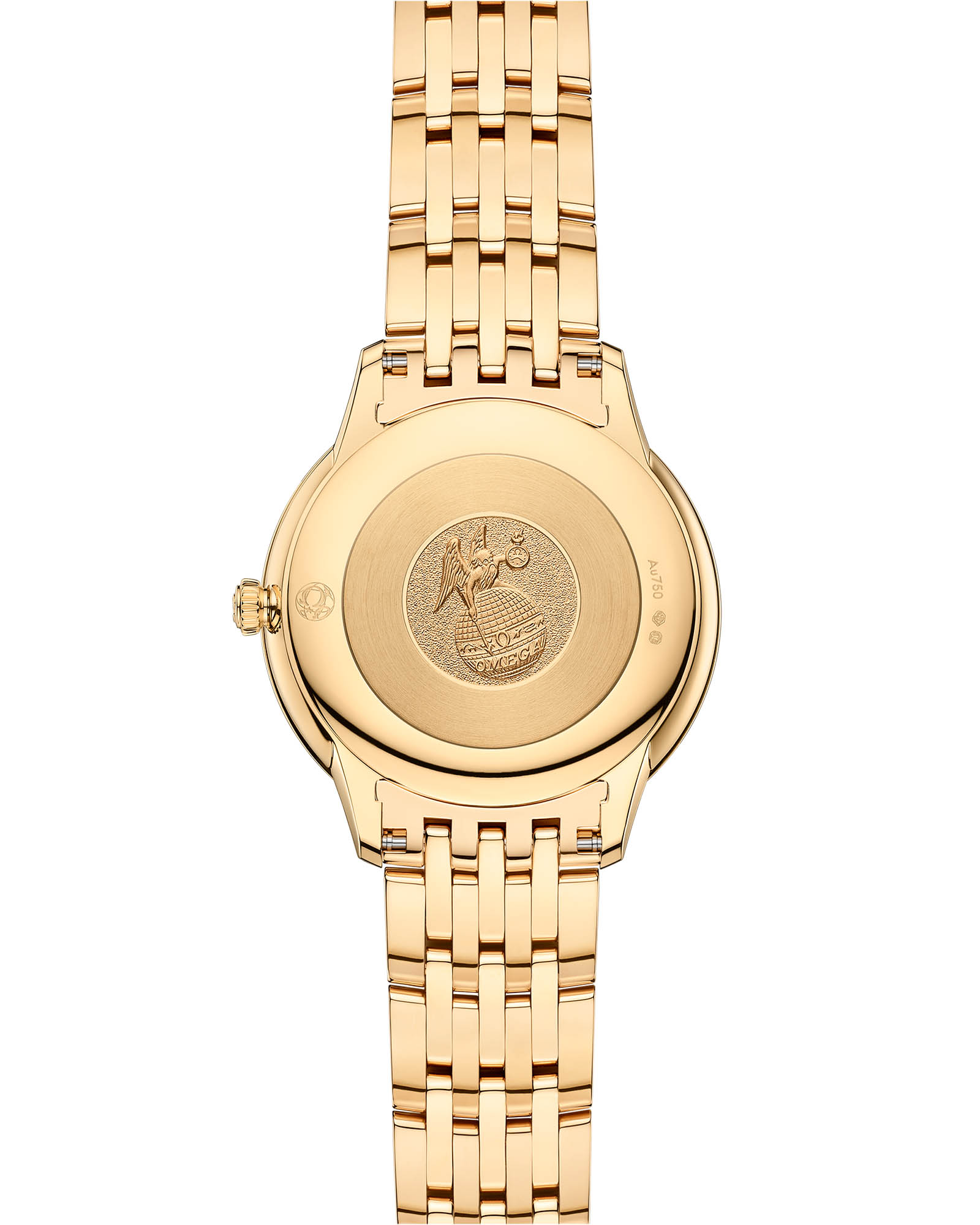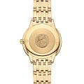 гармонично сочетаются с чередующимися римскими цифрами и бриллиантовыми метками. Лаконичный дизайн дополнен утонченной минутной шкалой в виде точечных маркеров на внутреннем секторе и задней крышкой с рельефным медальоном, изображающим бога времени Хроноса. Часы представлены с браслетом из 18-каратного желтого золота18-каратное золотоОбозначение по каратной системе пробирования, оно показывает, сколько драгоценного металла содержится в изделии. 18 карат - в составе 75% чистого золота, соответствует 750 пробе.