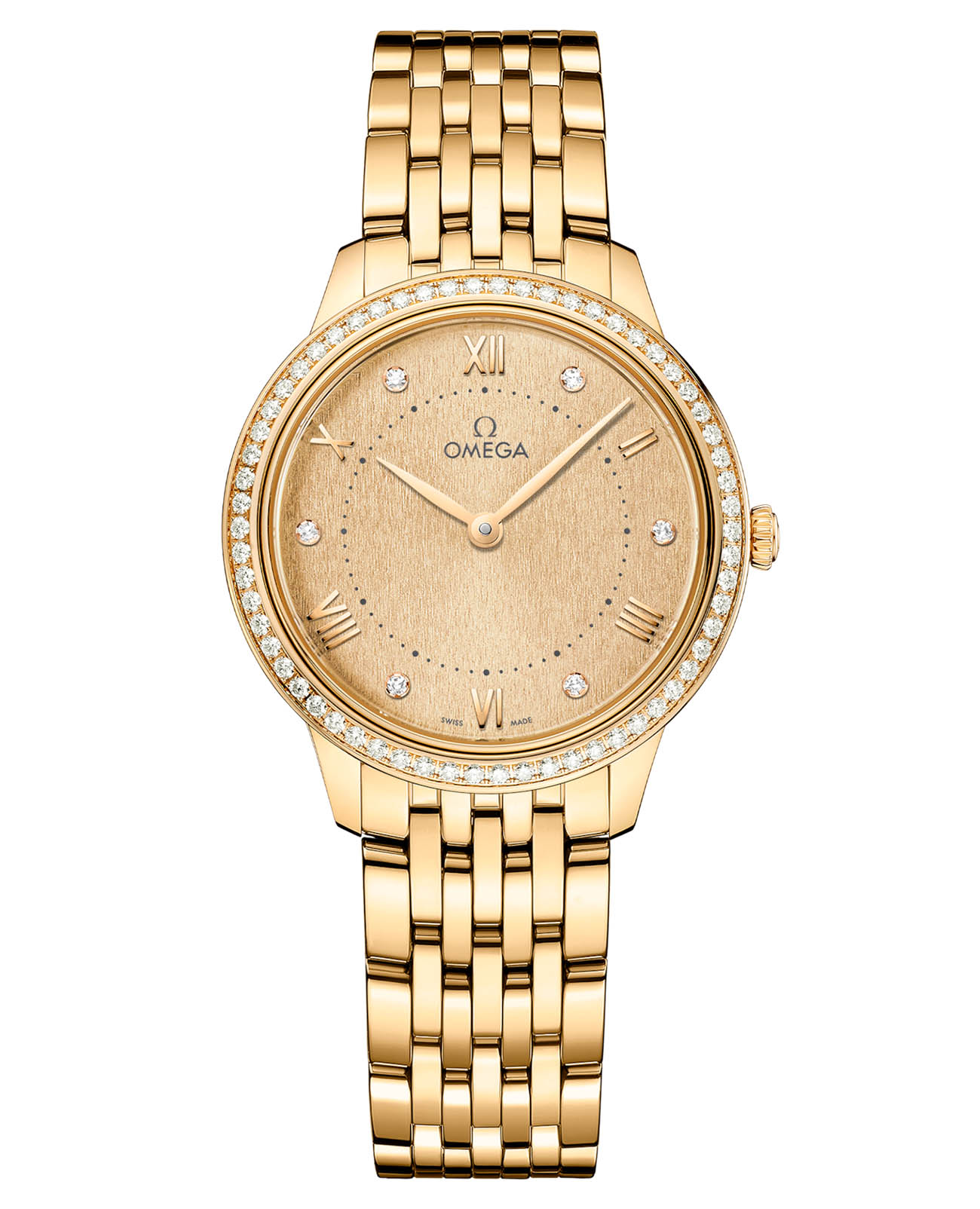 с бриллиантовым безелем демонстрирует циферблат из золота PVD Moonshine™ Gold с изысканным штампованным вертикальным узором и матовым покрытием, где стрелки с покрытием из желтого золота18-каратное золотоОбозначение по каратной системе пробирования, оно показывает, сколько драгоценного металла содержится в изделии. 18 карат - в составе 75% чистого золота, соответствует 750 пробе.