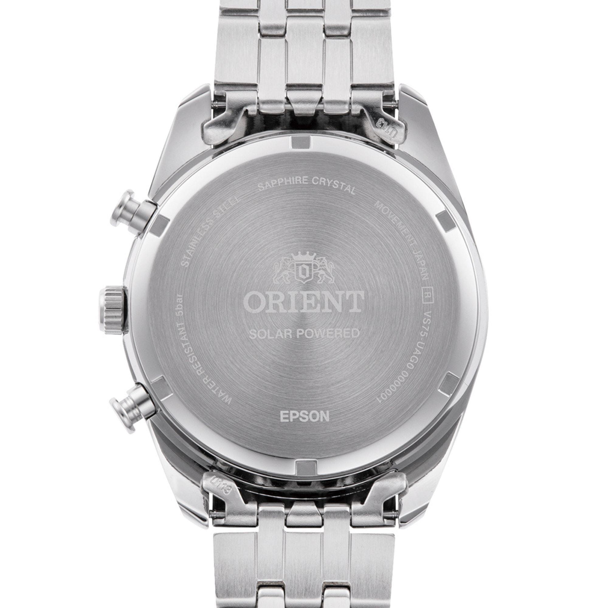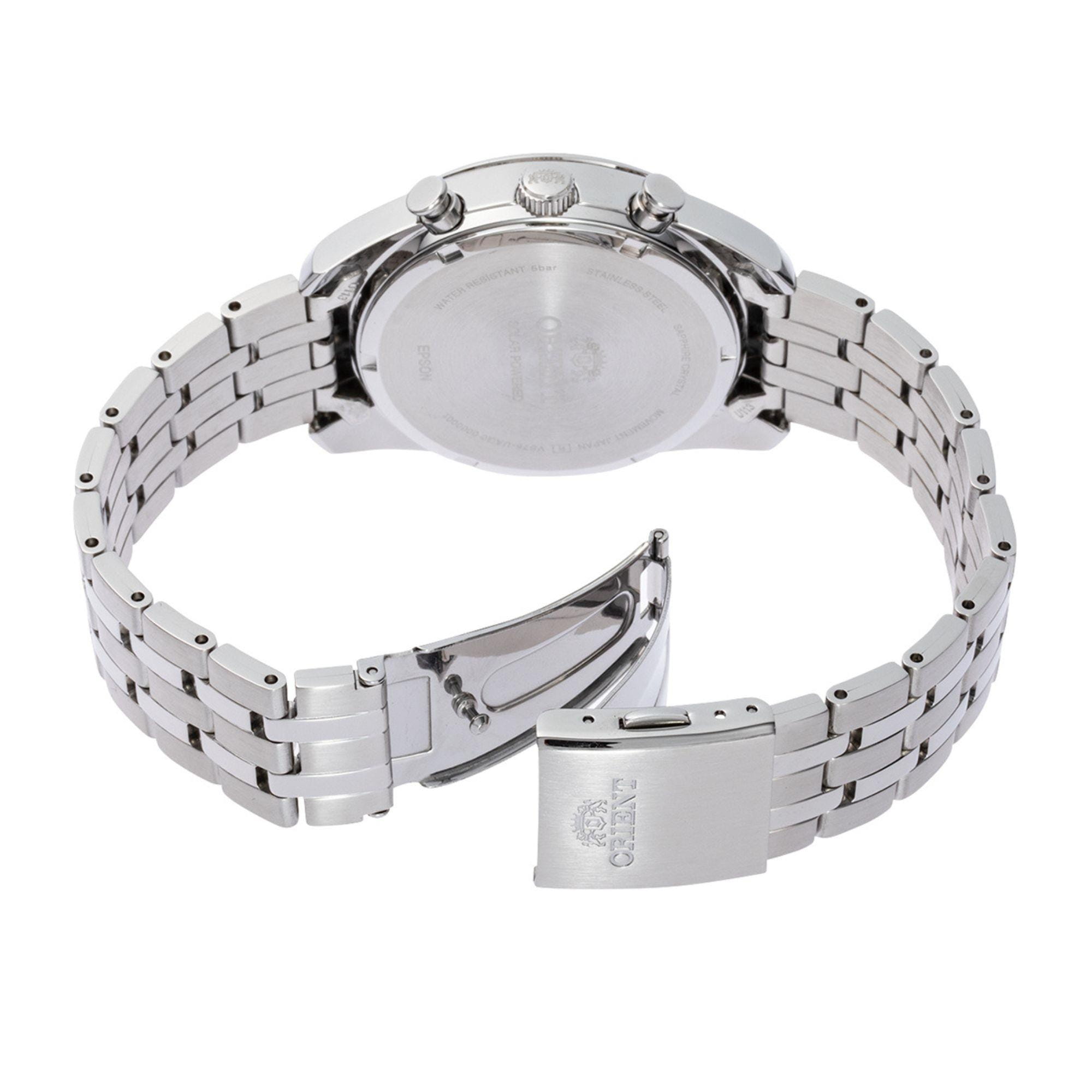 Модель Orient RA-TX0304L из коллекции Contemporary — это элегантный мужской хронограф, сочетающий современный дизайн и практичность. Корпус диаметром 40 мм выполнен из нержавеющей стали, подчеркивая сдержанный и универсальный стиль модели. Светло-голубой циферблат с тремя тёмными счётчиками создаёт эффект "ice panda", а стрелки и метки с люминесцентным покрытиемЛюминесцентное покрытиеПозволяет считывать показания времени в темноте. Производители наносят на стрелки, часовые индексы, безель или поверхность циферблата светонакопительный состав, дающий холодное свечение. обеспечивают отличную читаемость при любом освещении. Часы оснащены солнечным кварцевым механизмом Orient Cal. VS752, способным накапливать энергию и обеспечивать запас хода до 6 месяцев. Циферблат защищён сапфировым стекломСапфировое стеклоПрочный и надёжный материал из кристалла сапфира синтетического происхождения, характеризующийся особой твёрдостью и устойчивостью к царапинам и повреждениям., устойчивым к царапинам. Модель поддерживает функцию хронографаХронографФункция позволяет измерять отрезки времени с особой точностью: часы, минуты, секунды. Верным признаком хронографа является наличие на циферблате 3 дополнительных окошек-счётчиков. и отображение даты. Браслет выполнен из нержавеющей стали и дополнен раскладной застёжкойРаскладная застёжкаТакой тип застёжки используется только на браслетах из металла. Она никогда не раскрывается полностью, происходит разделение на 2 и более частей. Раскладывающая застёжка снизит вероятность потери часов к минимуму. с двойной защитой. Водонепроницаемость составляет 50 метров, что делает модель надёжной для повседневного использования. Orient RA-TX0304L — это продуманные часы для тех, кто ценит точность, надёжность и строгий, но выразительный внешний вид.