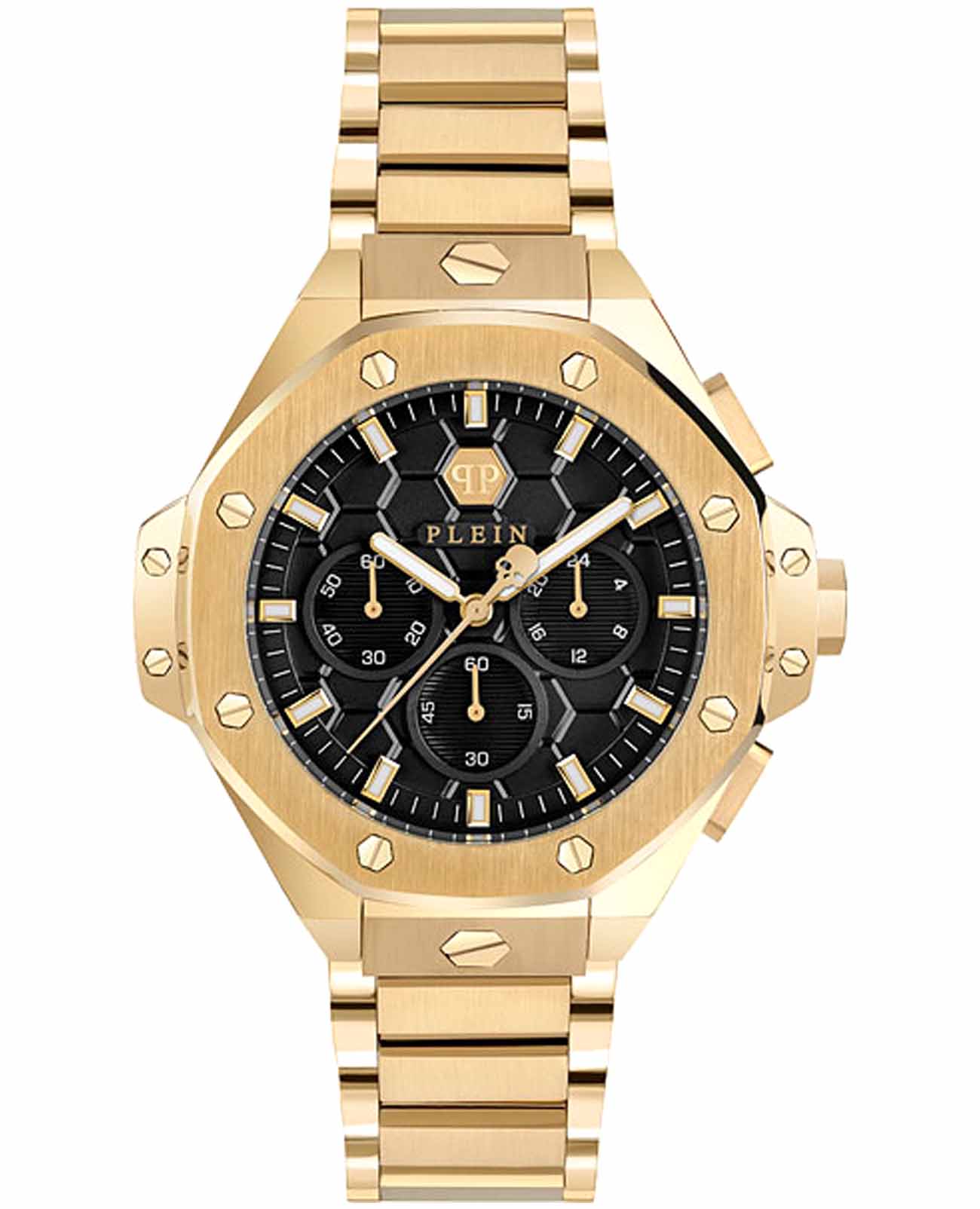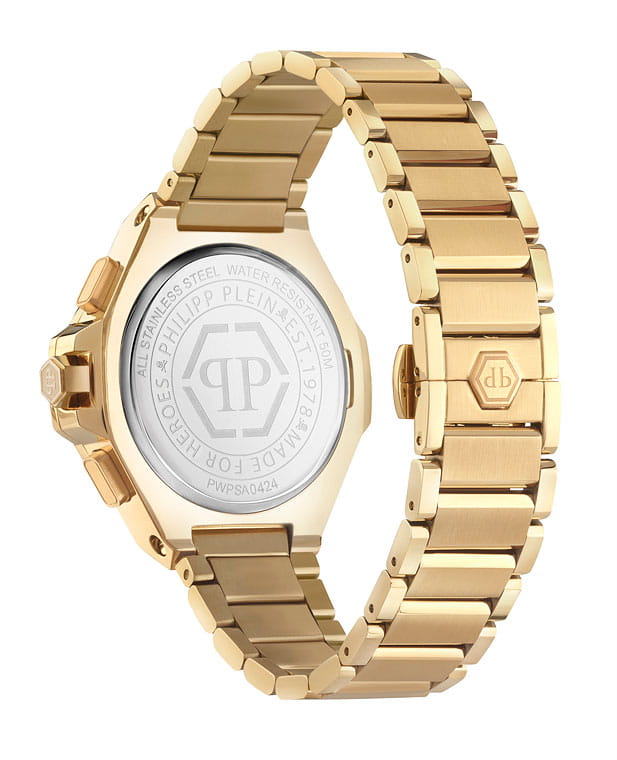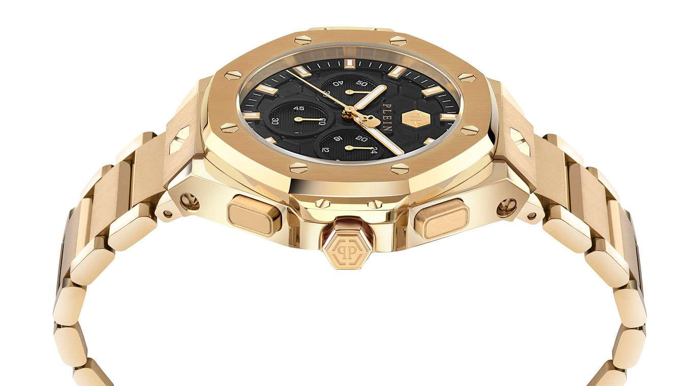 Philipp Plein Plein Chrono Royal 42 MM PWPSA0424 - это дерзкие и бескомпромиссные часы, воплощающие бунтарский дух бренда. Диаметр корпуса из прочной нержавеющей стали с PVD-покрытиемPVDУльтратонкое покрытие наносится в технике вакуумного напыления, сочетает в себе нитрид титана особой прочности со слоем золота или оксида хрома. Несёт в себе декоративную или защитную функцию. равен 42 мм. Стальной браслет на застёжке-бабочке с кнопкамиЗастёжка "бабочка"Такой вид застёжки дополняется предохранителями, помогающими избежать случайного раскрытия браслета. Обладают изящным исполнением. обеспечивает надёжную фиксацию и комфортное ношение. Минеральное стеклоМинеральное стеклоМинеральное стекло представляет собой искусственно выращенный минерал кварца. Такое стекло отличается особой устойчивостью к повреждениям и царапинам. Уступает по некоторым качествам сапфировому стеклу. защищает циферблат от царапин. Функциональность хронографаХронографФункция позволяет измерять отрезки времени с особой точностью: часы, минуты, секунды. Верным признаком хронографа является наличие на циферблате 3 дополнительных окошек-счётчиков. позволяет точно измерять время, а надежный кварцевый механизм гарантирует безупречную работу. Люминесцентное покрытиеЛюминесцентное покрытиеПозволяет считывать показания времени в темноте. Производители наносят на стрелки, часовые индексы, безель или поверхность циферблата светонакопительный состав, дающий холодное свечение. стрелок и меток позволит следить за временем даже в полной темноте. Граненая заводная головка. Влагозащита: 50 метров, позволит защитить корпус от случайных брызг или капель дождя. Идеальный аксессуар для тех, кто ценит индивидуальность и не боится выделяться из толпы.