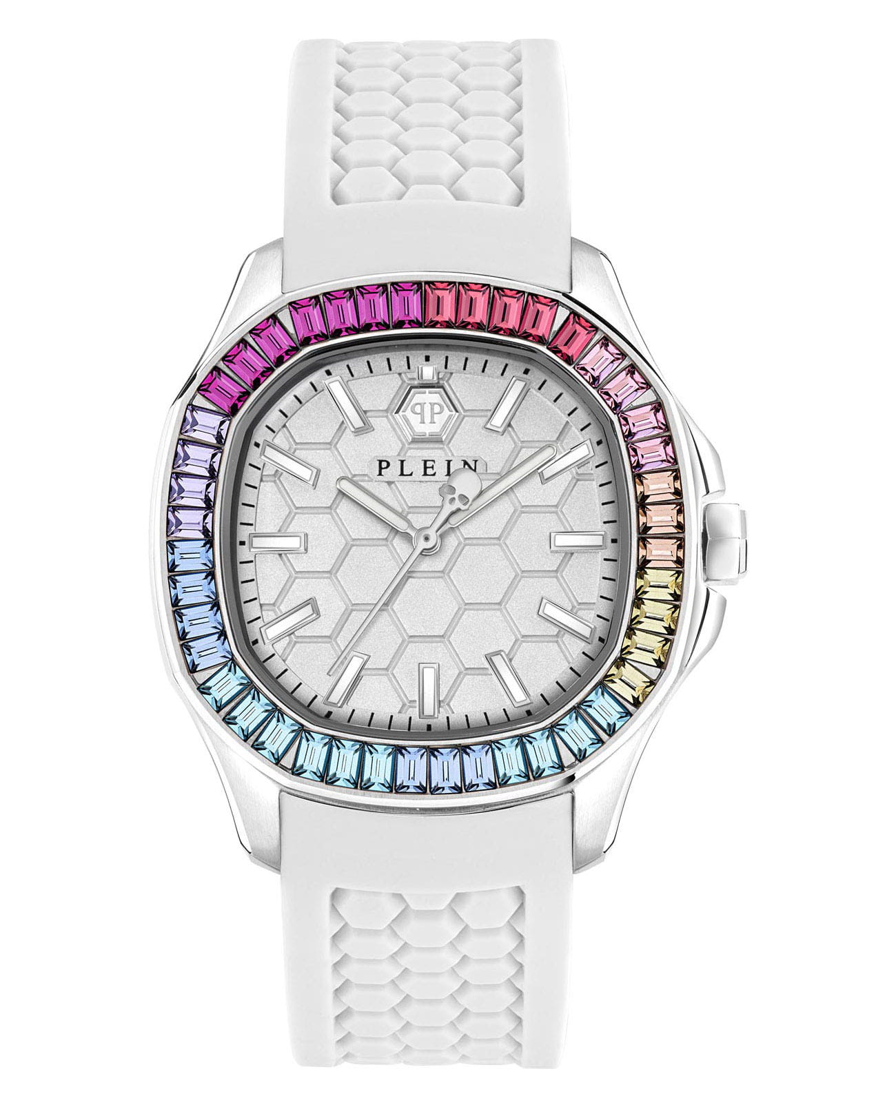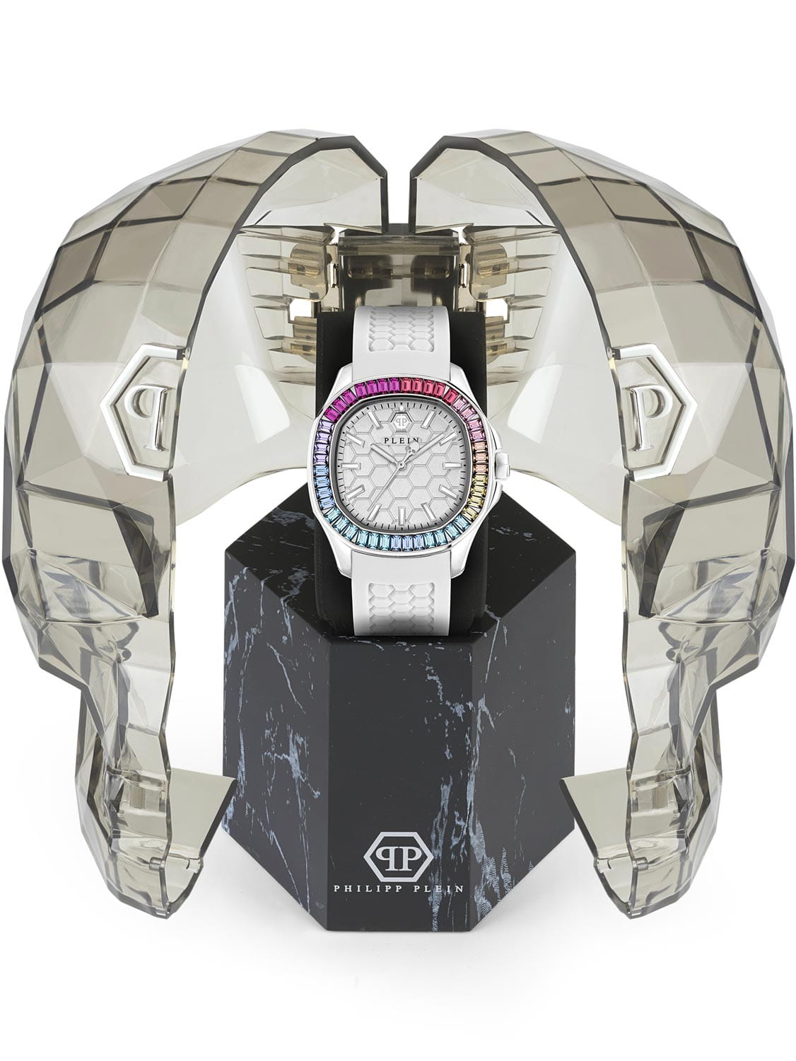 Яркие женские часы с минеральным стекломМинеральное стеклоМинеральное стекло представляет собой искусственно выращенный минерал кварца. Такое стекло отличается особой устойчивостью к повреждениям и царапинам. Уступает по некоторым качествам сапфировому стеклу. Philipp Plein PWTAA0223, кварцевый механизм с высокой точностью. Класс водозащиты: 50 метров, позволит защитить корпус от случайных брызг или капель дождя. Корпус часов изготовлен из стали с IP-покрытиемIP-покрытиеМетод ионного напыления. Демонстрирует повышенную устойчивость к истиранию, окислению и химическим веществам. Под воздействием высокого давления и температуры около 1500°C молекулы металла надёжно соединяются с частицами корпуса часов.. Стрелки и метки с люминесцентным покрытиемЛюминесцентное покрытиеПозволяет считывать показания времени в темноте. Производители наносят на стрелки, часовые индексы, безель или поверхность циферблата светонакопительный состав, дающий холодное свечение.. Стальной корпус с геометричным безелем, инкрустированным кристаллами.