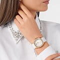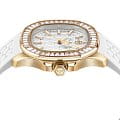 Philipp Plein THE $PECTRE LADY PWTAA0924 - дерзкое заявление любви к роскоши и бунтарскому стилю. Диаметр корпуса из прочной нержавеющей стали с PVD-покрытиемPVDУльтратонкое покрытие наносится в технике вакуумного напыления, сочетает в себе нитрид титана особой прочности со слоем золота или оксида хрома. Несёт в себе декоративную или защитную функцию. равен 38 мм. Силиконовый ремешок на стандартной застёжке обеспечивает надёжную фиксацию и комфортное ношение. Минеральное стеклоМинеральное стеклоМинеральное стекло представляет собой искусственно выращенный минерал кварца. Такое стекло отличается особой устойчивостью к повреждениям и царапинам. Уступает по некоторым качествам сапфировому стеклу. защищает циферблат от царапин. Люминесцентное покрытиеЛюминесцентное покрытиеПозволяет считывать показания времени в темноте. Производители наносят на стрелки, часовые индексы, безель или поверхность циферблата светонакопительный состав, дающий холодное свечение. стрелок и меток позволит следить за временем даже в полной темноте. БезельБезельВнешний ободок, закрепляющий стекло. В спортивных часах так называется поворотное кольцо с делениями на циферблате, выполняет роль таймера – замеряет отрезки времени на шкале. Неподвижный безель – элемент декора. Однонаправленно вращающийся безель на дайверских часах позволяет фиксировать моменты погружения и выныривания на поверхность. инкрустирован кристаллами Preciosa. Влагозащита: 50 метров, позволит защитить корпус от случайных брызг или капель дождя. Идеальный аксессуар для тех, кто ценит индивидуальность и не боится выделяться из толпы.