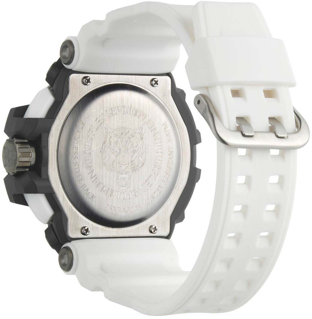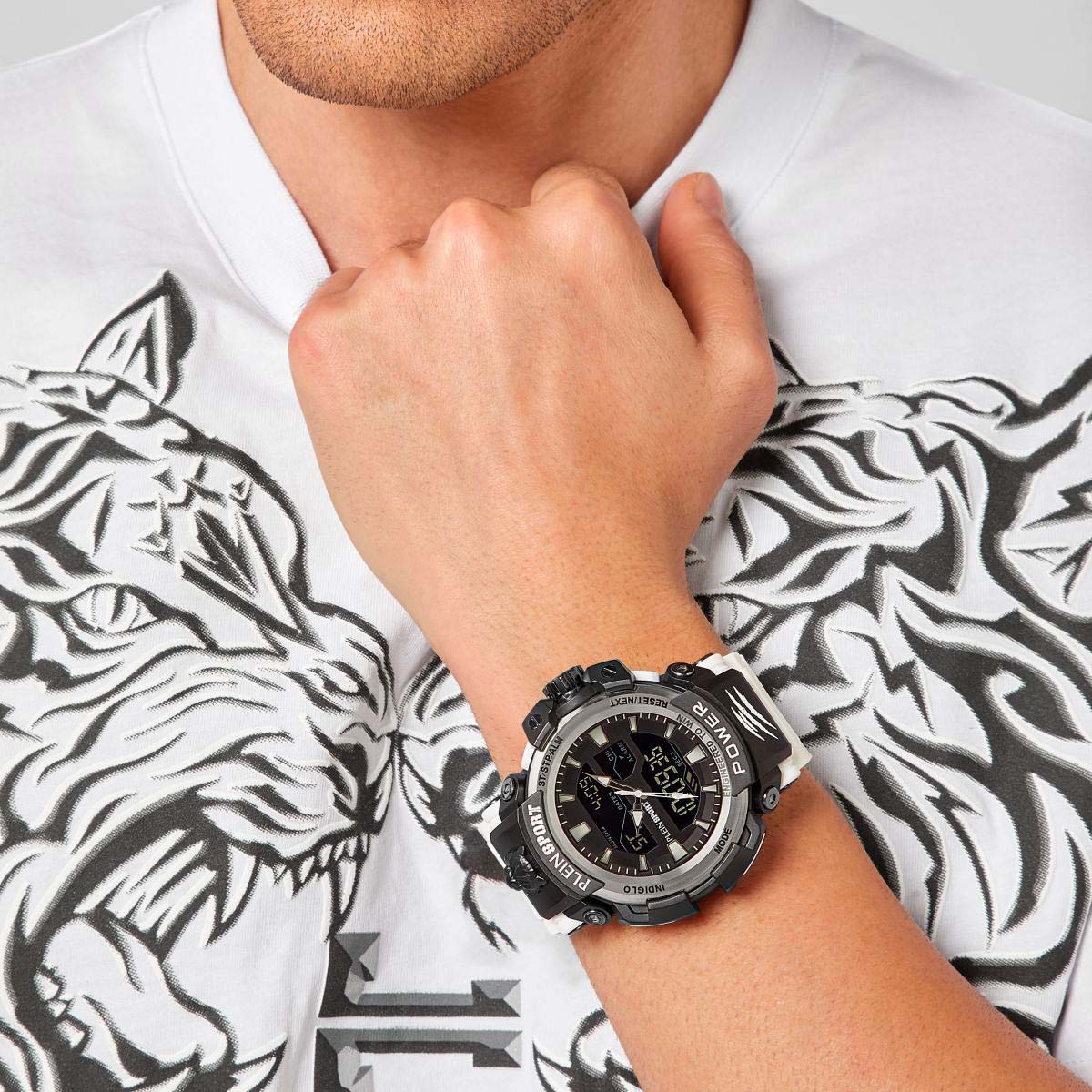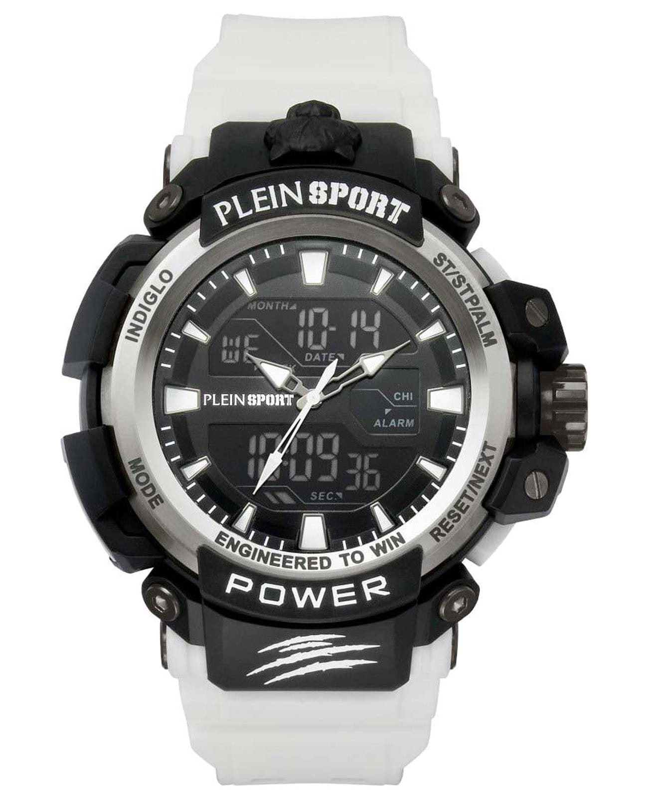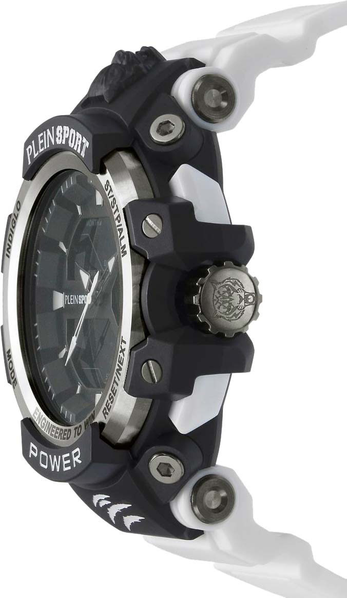 Немецкие мужские кварцевые часы-хронографХронографФункция позволяет измерять отрезки времени с особой точностью: часы, минуты, секунды. Верным признаком хронографа является наличие на циферблате 3 дополнительных окошек-счётчиков. с секундомеромСекундомерСекундоме́р — прибор, способный измерять интервалы времени с точностью до долей секунды. и будильникомБудильникБуди́льник — часы, в заданный момент времени подающие звуковой, световой и/или в редких случаях другой сигнал. Plein Sport Combat PSNBA0223, кварцевый механизм с высокой точностью. Класс водозащиты: 50 метров, позволит защитить корпус от случайных брызг или капель дождя. Корпус часов изготовлен из стали и пластика. Электролюминесцентная подсветкаЭлектролюминесцентная подсветкаЭлектролюминесцентная панель устанавливается под ЖК-экраном часов, при нажатии кнопки электричество преобразуется в свет за счёт подачи напряжения на атомы фосфора, такой тип подсветки позволяет освещать весь циферблат. освещает весь циферблат, после отпускания кнопки свечение продолжается еще некоторое время. Силиконовый ремешок на стандартной застёжке.