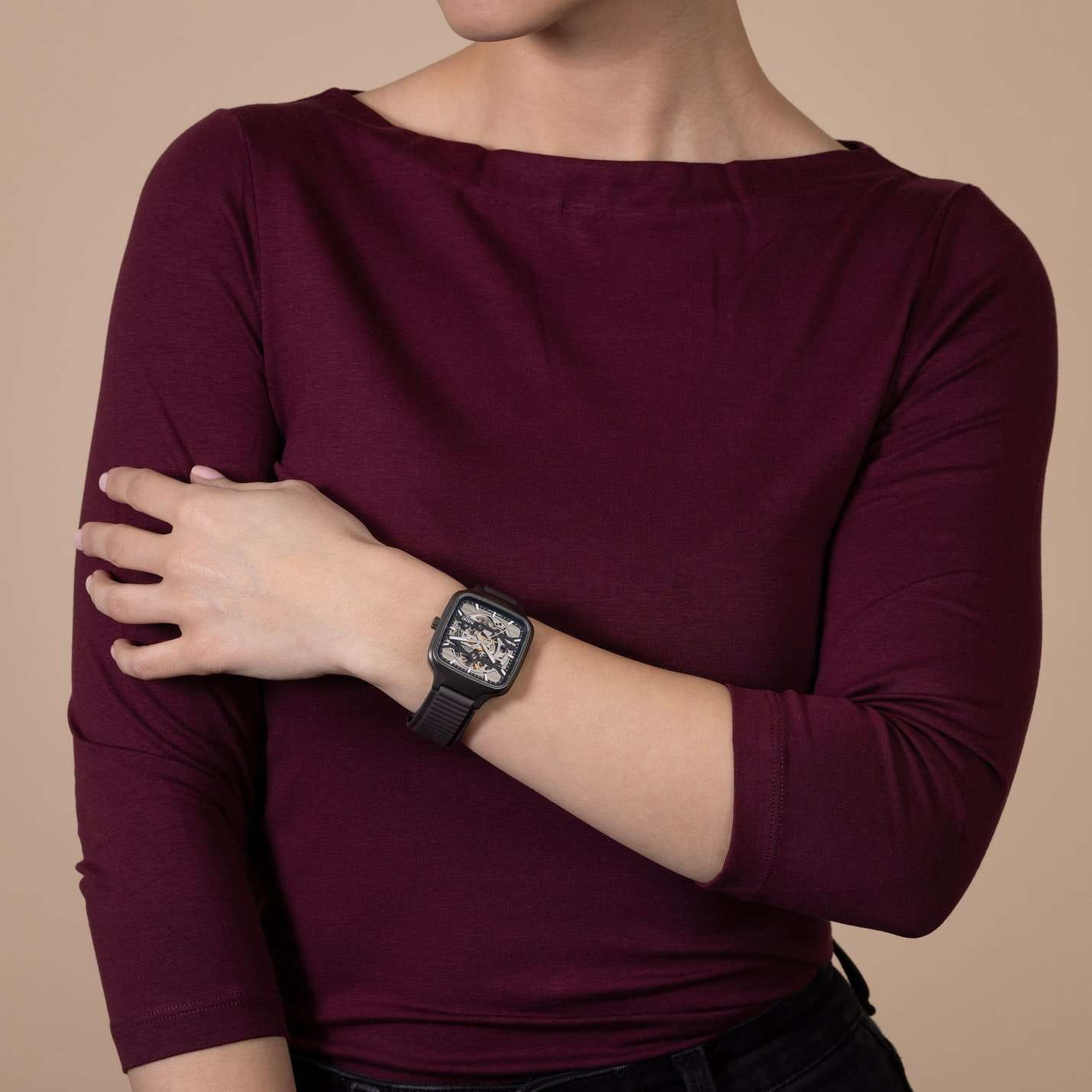 Универсальные механические часы с автоподзаводом Rado из коллекции True Square — это уникальное сочетание передовых технологий и высокого часового искусства. Корпус квадратной формы, размером 38 мм и толщиной 9,7 мм, выполнен из матовой высокотехнологичной керамикиВысокотехнологичная керамикаИнновационный запатентованный Rado материал с гладкой или матовой поверхностью. Керамика за счёт кристаллической структуры обладает повышенной устойчивостью от возникновения царапин. Материал способен принимать температуру тела человека, обеспечивая невероятный комфорт при ношении. чёрного цвета, что обеспечивает исключительную прочность, лёгкость и гипоаллергенность. Циферблат частично скелетонизирован, открывая вид на сложную структуру механизма. Верхний слой с пескоструйной обработкой оформлен белыми индексами и минутной шкалой с люминесцентным покрытиемЛюминесцентное покрытиеПозволяет считывать показания времени в темноте. Производители наносят на стрелки, часовые индексы, безель или поверхность циферблата светонакопительный состав, дающий холодное свечение. Super-Luminova®, обеспечивающими отличную читаемость. Нижний слой демонстрирует декоративные узоры «Côtes de Genève», гармонирующие с механизмом. В положении 4 часов расположен подвижной якорь — символ бренда. Циферблат защищён плоским сапфировым стекломСапфировое стеклоПрочный и надёжный материал из кристалла сапфира синтетического происхождения, характеризующийся особой твёрдостью и устойчивостью к царапинам и повреждениям. с антибликовым покрытиемАнтибликовое покрытиеСлой оксида металла в 0,13-0,3 микрон, благодаря которому стекло часов не бликует и не отражает свет. Антибликовое покрытие уменьшает отражение света в 10 раз, обеспечивая отличную читаемость показателей циферблата.. Механизм — автоматический с антимагнитной пружиной Nivachron™Nivachron™Специально разработанный инновационный сплав Nivachron™ повышает устойчивость часов к воздействию магнитных полей., отрегулированный в пяти положениях, с запасом хода 80 часов. Часы оснащены каучуковым ремешком чёрного цвета и раскладывающейся застёжкой с удлинением из нержавеющей стали, покрытой матовой высокотехнологичной керамикойВысокотехнологичная керамикаИнновационный запатентованный Rado материал с гладкой или матовой поверхностью. Керамика за счёт кристаллической структуры обладает повышенной устойчивостью от возникновения царапин. Материал способен принимать температуру тела человека, обеспечивая невероятный комфорт при ношении.. Водонепроницаемость 50 м позволяет использовать часы в повседневных условиях. Гарантия — 5 лет. Идеальный выбор для тех, кто ценит инновации, дизайн и швейцарское качество.