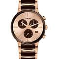 Мужские кварцевые часы Rado Centrix Chronograph — это гармоничное сочетание художественного дизайна и технического совершенства. Корпус диаметром 41 мм и толщиной 11,4 мм выполнен из нержавеющей стали с PVD-покрытиемPVDУльтратонкое покрытие наносится в технике вакуумного напыления, сочетает в себе нитрид титана особой прочности со слоем золота или оксида хрома. Несёт в себе декоративную или защитную функцию. розового золота. Циферблат цвета шампань с эффектом «солнечные лучи» оформлен розовыми индексами с люминесцентным покрытиемЛюминесцентное покрытиеПозволяет считывать показания времени в темноте. Производители наносят на стрелки, часовые индексы, безель или поверхность циферблата светонакопительный состав, дающий холодное свечение. Super-Luminova®, обеспечивающим отличную читаемость в темноте. Циферблат защищён выпуклым сапфировым стекломСапфировое стеклоПрочный и надёжный материал из кристалла сапфира синтетического происхождения, характеризующийся особой твёрдостью и устойчивостью к царапинам и повреждениям. с антибликовым покрытиемАнтибликовое покрытиеСлой оксида металла в 0,13-0,3 микрон, благодаря которому стекло часов не бликует и не отражает свет. Антибликовое покрытие уменьшает отражение света в 10 раз, обеспечивая отличную читаемость показателей циферблата. с обеих сторон. Механизм — швейцарский кварцевый с функцией хронографаХронографФункция позволяет измерять отрезки времени с особой точностью: часы, минуты, секунды. Верным признаком хронографа является наличие на циферблате 3 дополнительных окошек-счётчиков., оснащённый 22 камнями и технологиями Precidrive и Heavydrive, обеспечивающими точность хода ±10 секунд в год. Циферблат включает три субциферблата: 30-минутный счётчик, индикатор одной десятой секунды и малые секунды в положении 6 часов. Окошко даты расположено в положении 4 часов. Часы оснащены браслетом из полированной нержавеющей стали с вставками из высокотехнологичной керамикиВысокотехнологичная керамикаИнновационный запатентованный Rado материал с гладкой или матовой поверхностью. Керамика за счёт кристаллической структуры обладает повышенной устойчивостью от возникновения царапин. Материал способен принимать температуру тела человека, обеспечивая невероятный комфорт при ношении. коричневого цвета и застёжка «бабочка» с кнопкамиЗастёжка "бабочка"Такой вид застёжки дополняется предохранителями, помогающими избежать случайного раскрытия браслета. Обладают изящным исполнением. из матовой стали. Водонепроницаемость 50 м позволяет использовать часы в повседневных условиях. Гарантия — 5 лет. Идеальный выбор для тех, кто ценит точность, стиль и швейцарское качество.