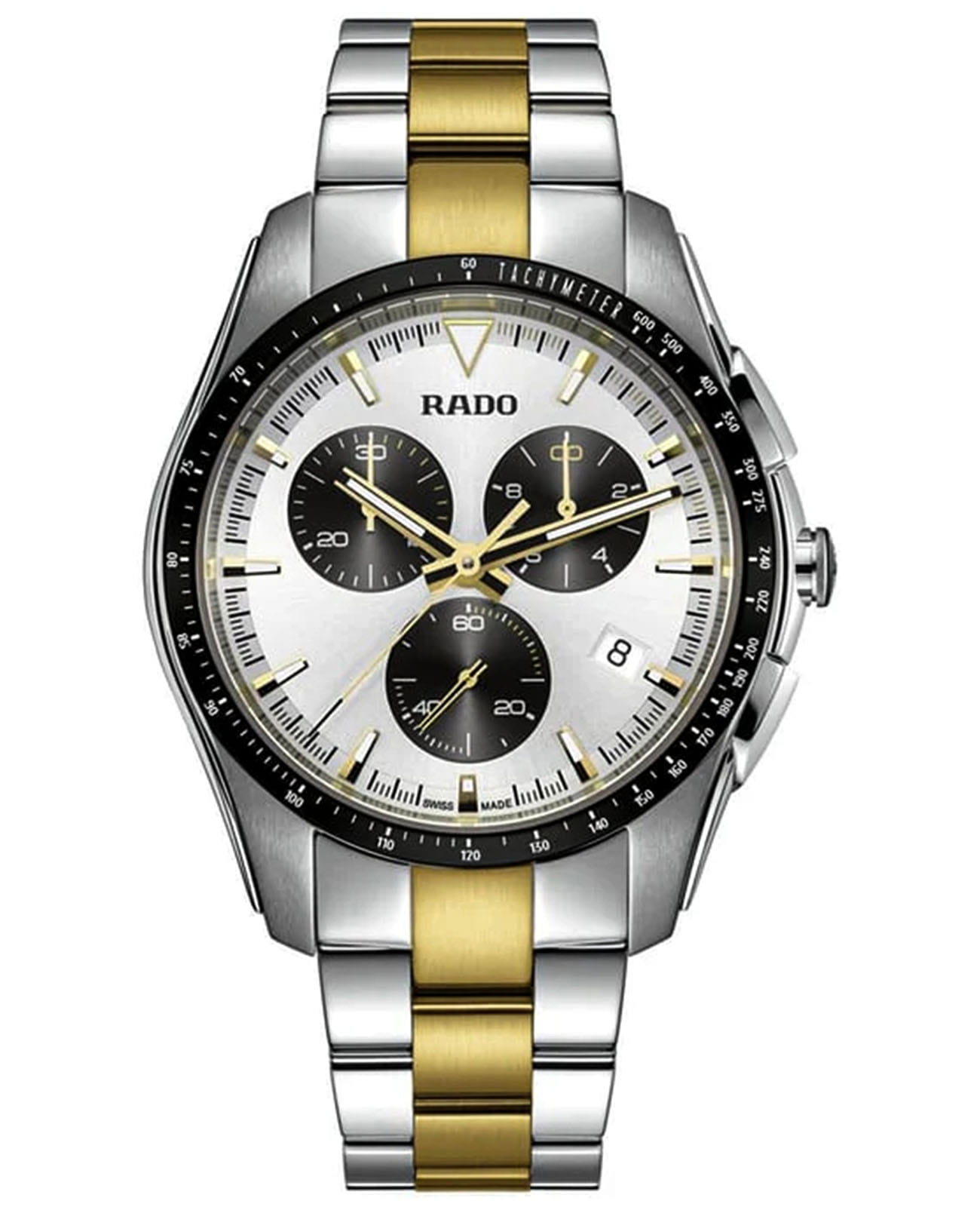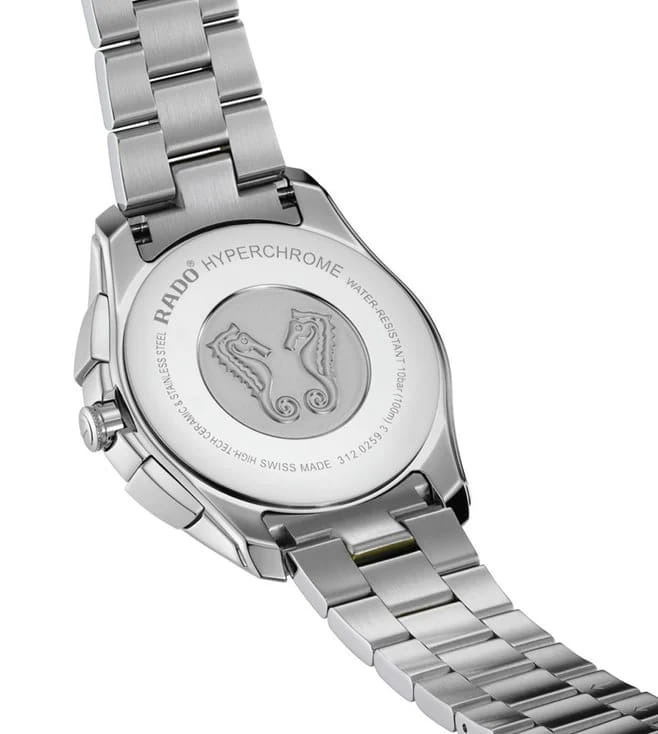 Мужские наручные часы-хронографХронографФункция позволяет измерять отрезки времени с особой точностью: часы, минуты, секунды. Верным признаком хронографа является наличие на циферблате 3 дополнительных окошек-счётчиков. Rado Hyperchrome Chronograph. Корпус часов изготовлен из нержавеющей стали. БезельБезельВнешний ободок, закрепляющий стекло. В спортивных часах так называется поворотное кольцо с делениями на циферблате, выполняет роль таймера – замеряет отрезки времени на шкале. Неподвижный безель – элемент декора. Однонаправленно вращающийся безель на дайверских часах позволяет фиксировать моменты погружения и выныривания на поверхность. из нержавеющей стали с PVD-покрытиемPVDУльтратонкое покрытие наносится в технике вакуумного напыления, сочетает в себе нитрид титана особой прочности со слоем золота или оксида хрома. Несёт в себе декоративную или защитную функцию.. Стальной браслет с частичным PVD-покрытиемPVDУльтратонкое покрытие наносится в технике вакуумного напыления, сочетает в себе нитрид титана особой прочности со слоем золота или оксида хрома. Несёт в себе декоративную или защитную функцию. на застёжке «бабочка» с кнопкамиЗастёжка "бабочка"Такой вид застёжки дополняется предохранителями, помогающими избежать случайного раскрытия браслета. Обладают изящным исполнением. . БезельБезельВнешний ободок, закрепляющий стекло. В спортивных часах так называется поворотное кольцо с делениями на циферблате, выполняет роль таймера – замеряет отрезки времени на шкале. Неподвижный безель – элемент декора. Однонаправленно вращающийся безель на дайверских часах позволяет фиксировать моменты погружения и выныривания на поверхность. со шкалой тахиметраТахиметрРазмеченная шкала, располагается на ободке или безеле часов. Тахиметр позволяет рассчитать скорость на определённом участке пути, расстояние измеряется в километрах или милях.. Окошко даты находится в положении 4 часа. Стрелки и метки с люминесцентным покрытиемЛюминесцентное покрытиеПозволяет считывать показания времени в темноте. Производители наносят на стрелки, часовые индексы, безель или поверхность циферблата светонакопительный состав, дающий холодное свечение.. Сапфировое стеклоСапфировое стеклоПрочный и надёжный материал из кристалла сапфира синтетического происхождения, характеризующийся особой твёрдостью и устойчивостью к царапинам и повреждениям. с антибликовым покрытиемАнтибликовое покрытиеСлой оксида металла в 0,13-0,3 микрон, благодаря которому стекло часов не бликует и не отражает свет. Антибликовое покрытие уменьшает отражение света в 10 раз, обеспечивая отличную читаемость показателей циферблата. устойчивое к мелким механическим повреждениям. Класс водозащиты: 100 метров, позволит плавать, нырять и заниматься другими водными видами спорта.